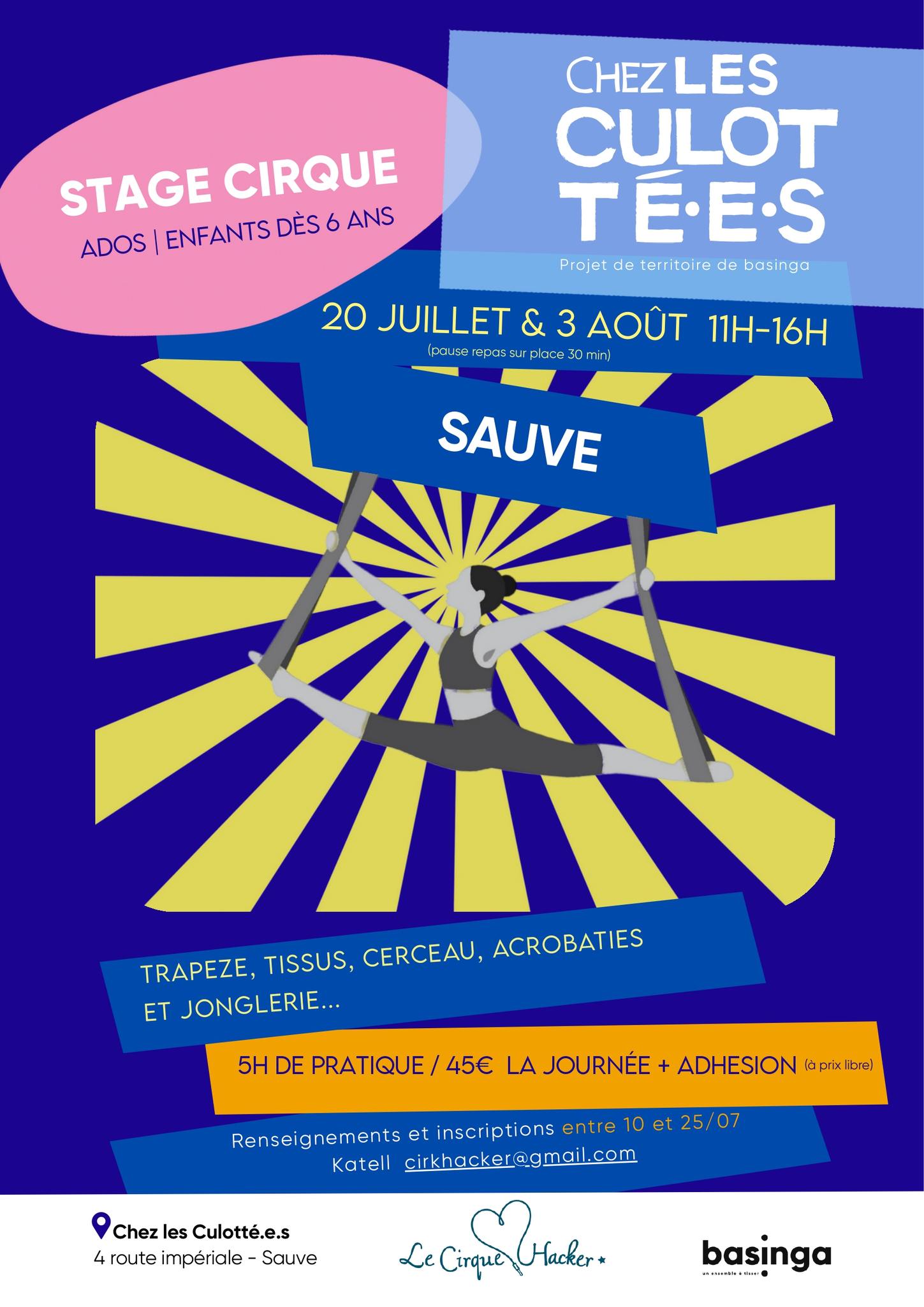 STAGE CIRQUE à Sauve le 20 juillet et le 3 août Katell aka Le Cirk Hacker propose pour les enfants à partir de 6 ans deux fois 5h de pratique pour découvrir ou approfondir les techniques aériennes (trapèze, cerceau, tissu) les acrobaties et la jonglerie.