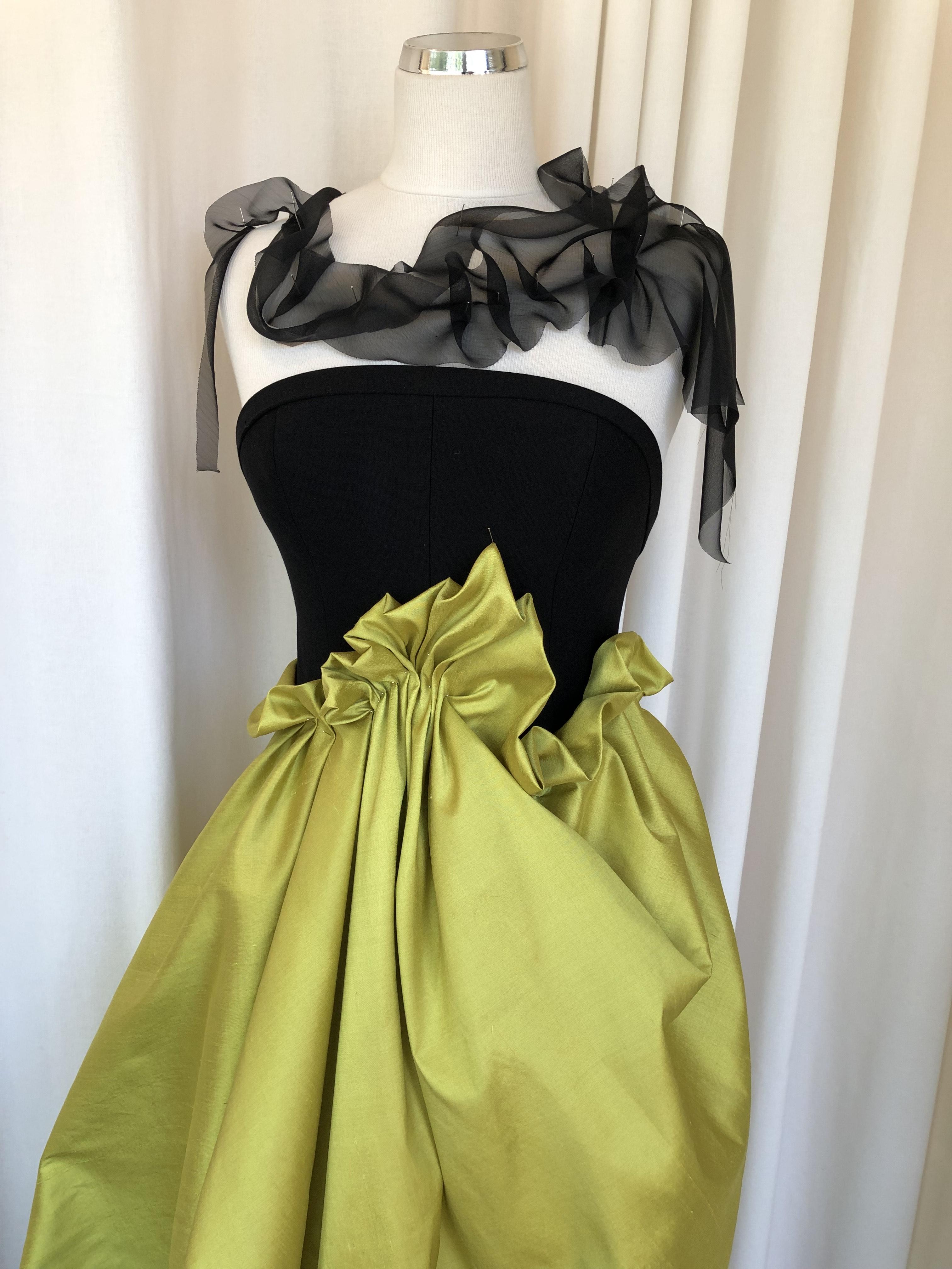 Le tissu est posé directement sur le corps, puis prend forme, en respectant à la fois les qualités propres de la matière et les lignes du corps. Annick travaille tel un sculpteur, façonnant peu à peu sa création jusqu’à ce qu’elle se transforme en un vêtement unique et sublime.