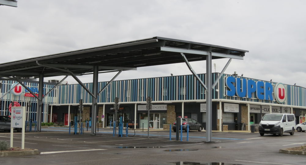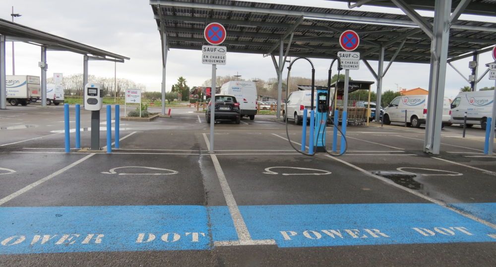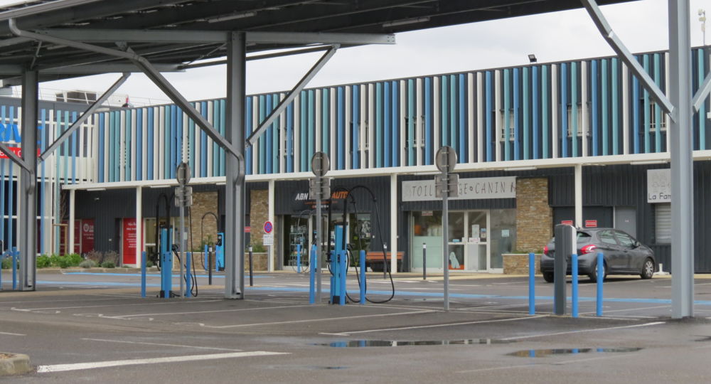 Plusieurs bornes de recharge pour véhicules électriques sur le parking du Super U à Aimargues.