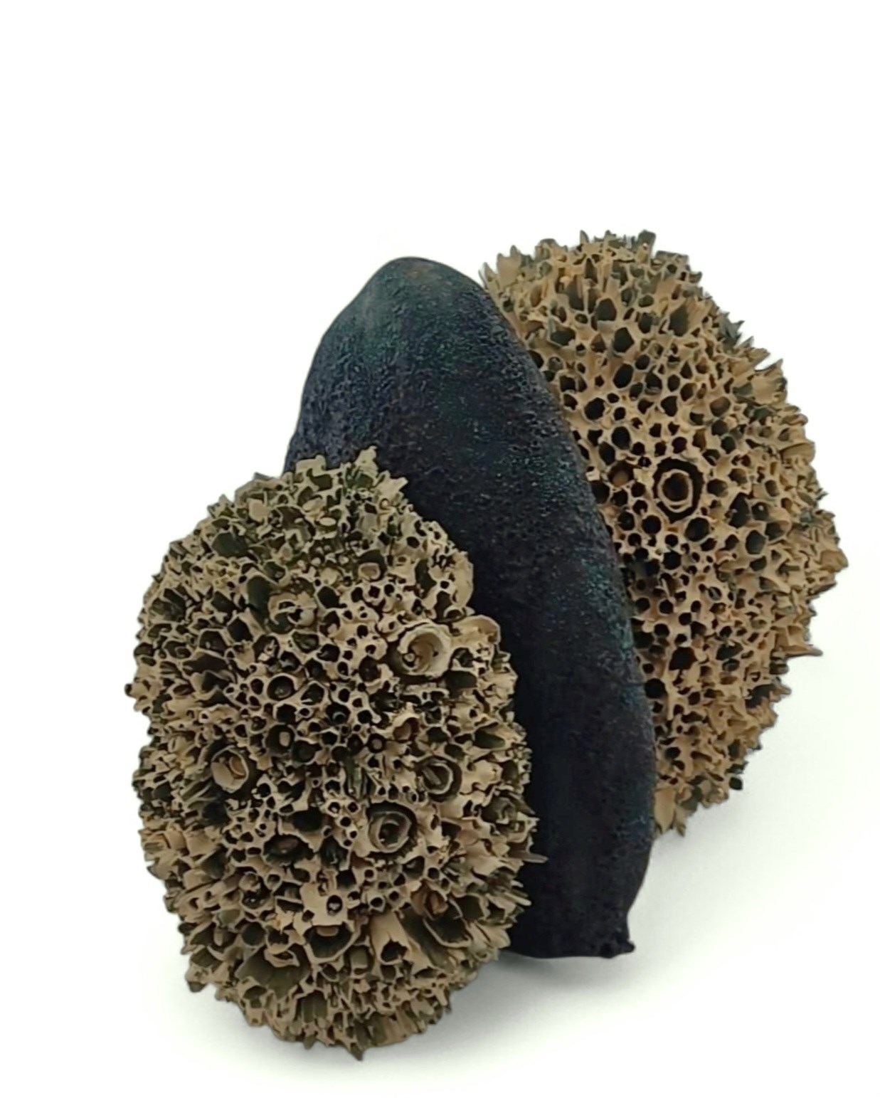 La forme de l’objet demeure primordiale : intérieur/extérieur, ouvert/fermé. J’utilise la technique du raku « naked », souvent combinée à la porcelaine.