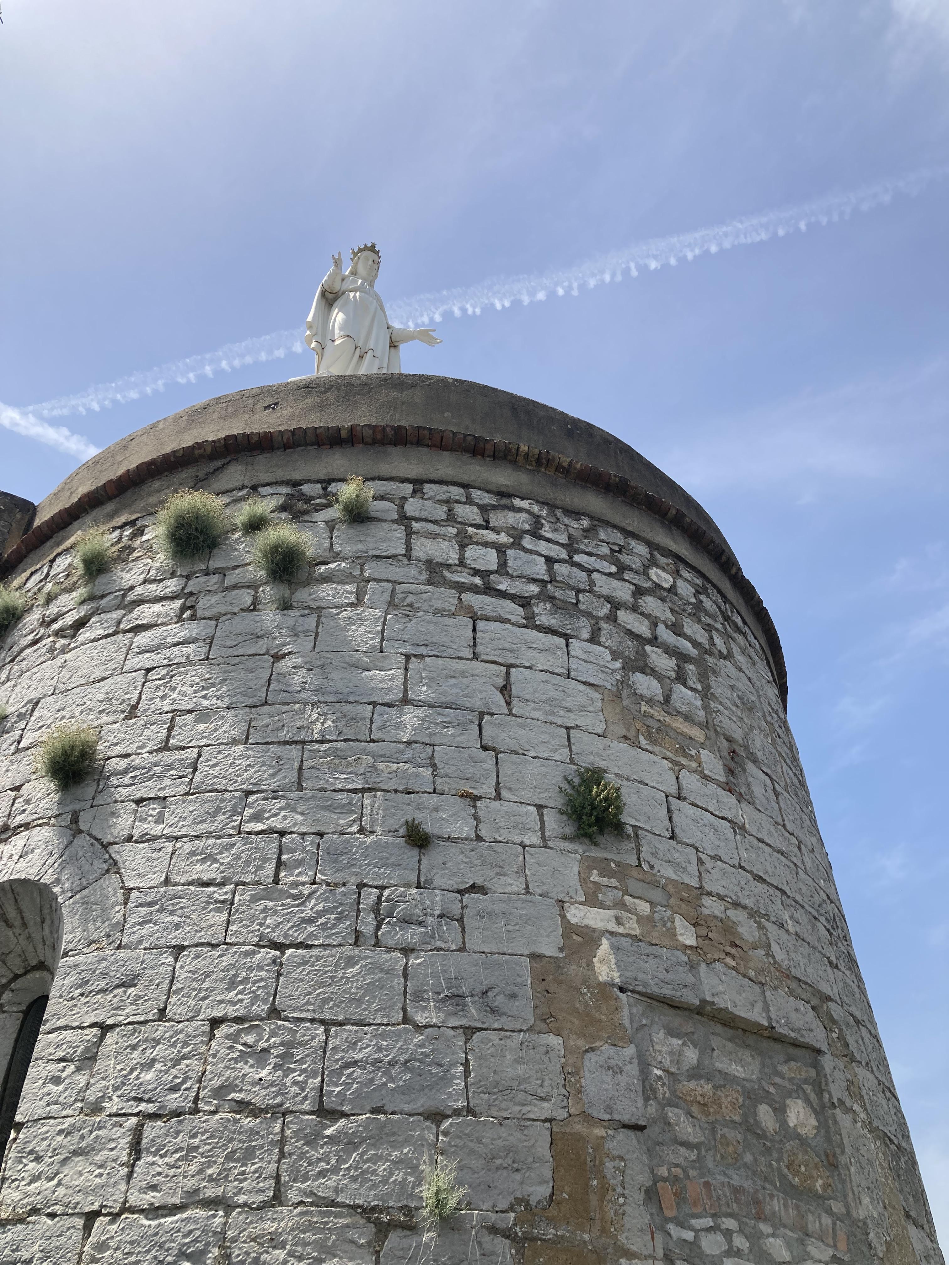 La statue de la Vierge a été installée en 1874, elle mesure 5 mètres de haut, elle est en fonte, fondue aux forges d’Alès.