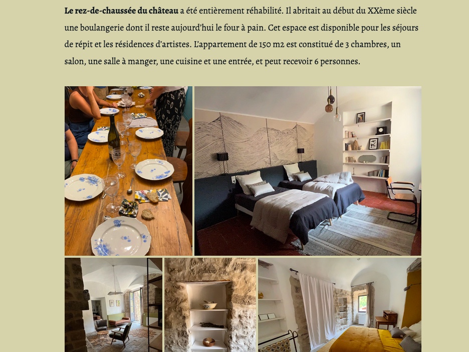 La résidence hors saison comprend l’hébergement dans un gîte de charme en bordure des Cévennes, 6 personnes maximum, 3 chambres individuelles, une cuisine à disposition, deux salons et une salle à manger. Le gîte est situé dans un village médiéval calme et en bordure de rivière, de nombreuses randonnées sont possibles. En saison sont accueillis des séjours de répit et les artistes en résidence (maximum 1 artiste) sont accueilli·es contre ateliers à nos résidentes en mixité FLINTA (pas d’homme cis). En fin de séjour un concert ou une exposition dans la cour du château ou dans l’Eglise romane du 13ème siècle sera organisé en collaboration avec l’artiste.