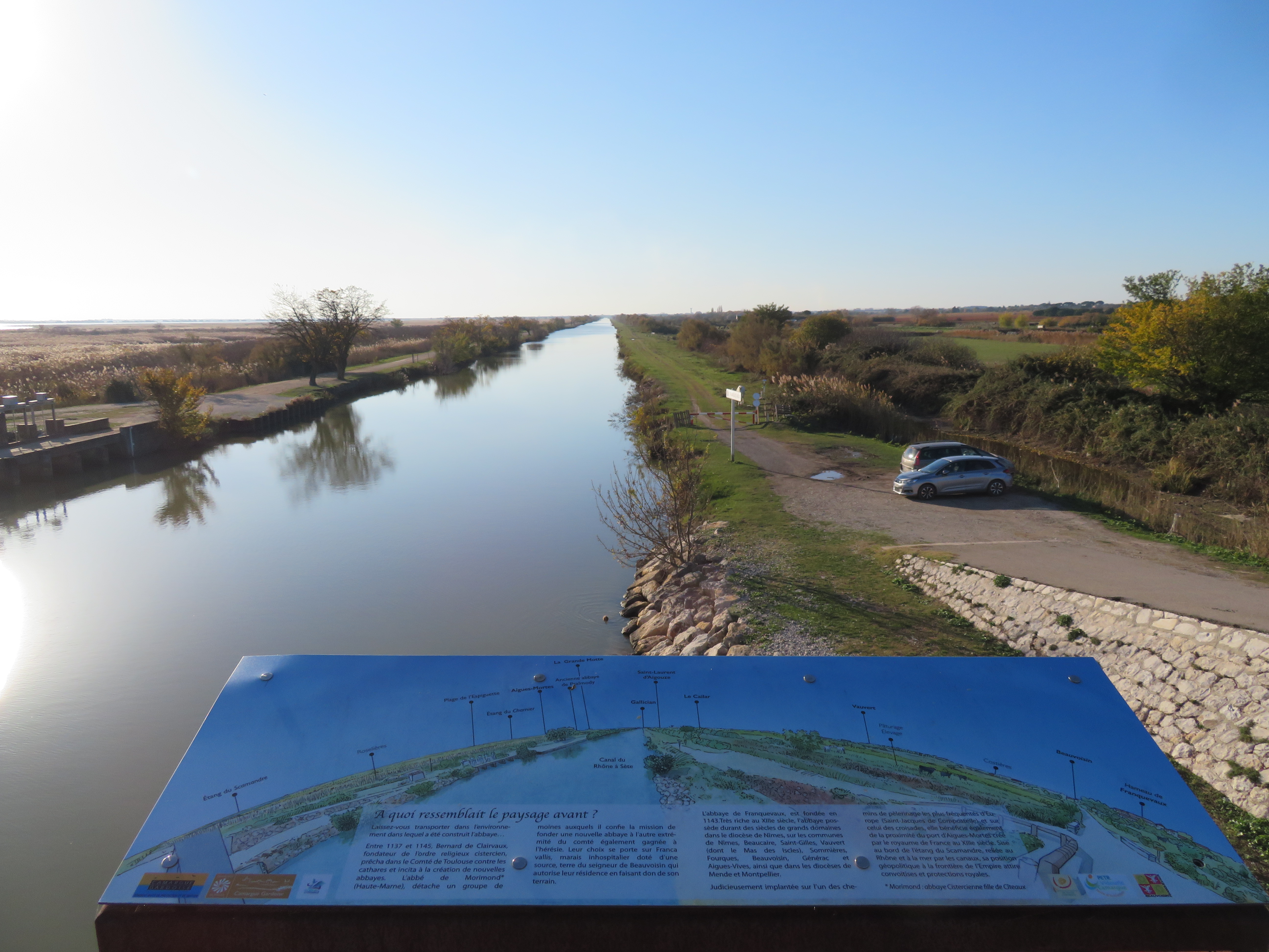 Vous trouverez tout au long du cheminement, 5 panneaux retraçant la vie de l’abbaye, pour finir sur le Pont de Franquevaux, d’où vous aurez une vue exceptionnelle sur le canal du Rhône à Sète et les étangs alentours. Laissez vous transporter dans l’environnement dans lequel a été construit l’abbaye.