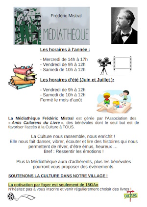 Du 01/09 au 31/05 le mercredi de 14h à 17h. Le vendredi de 9h à 12h. Le samedi de 10h à 12h.