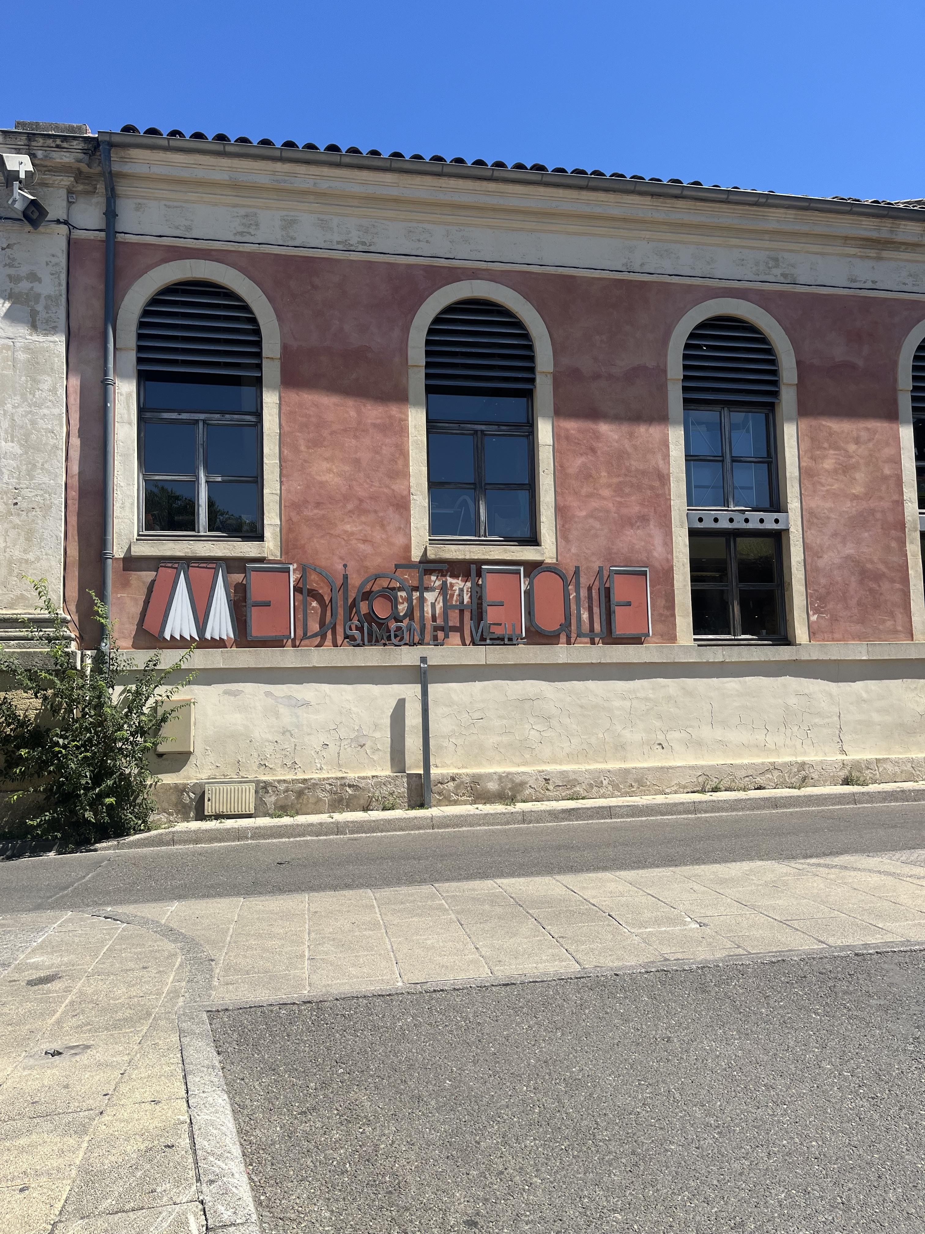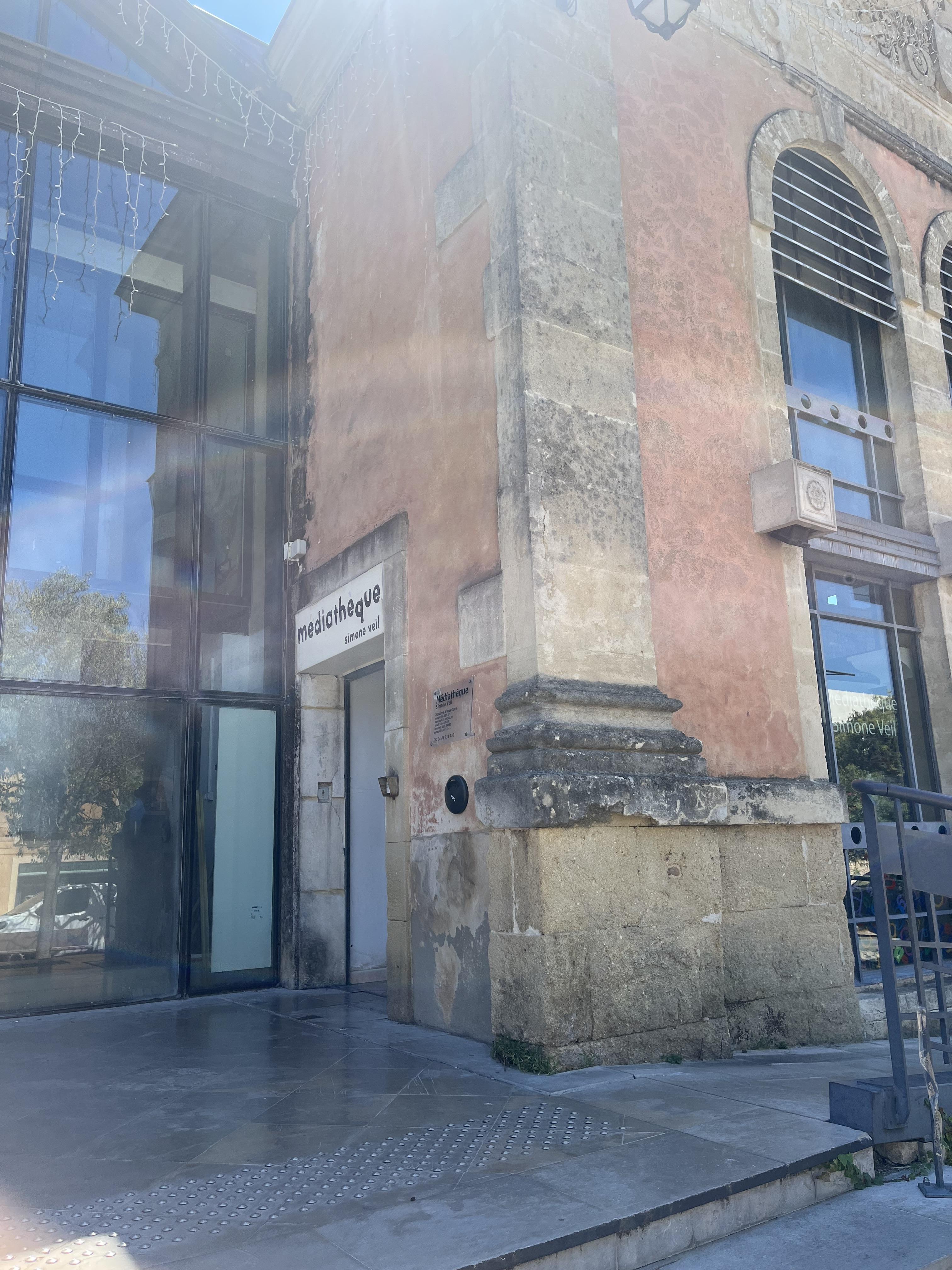 La médiathèque Simone Veil est collée aux Halles et donne sur une place. Proche d’un parking avec places bleues.