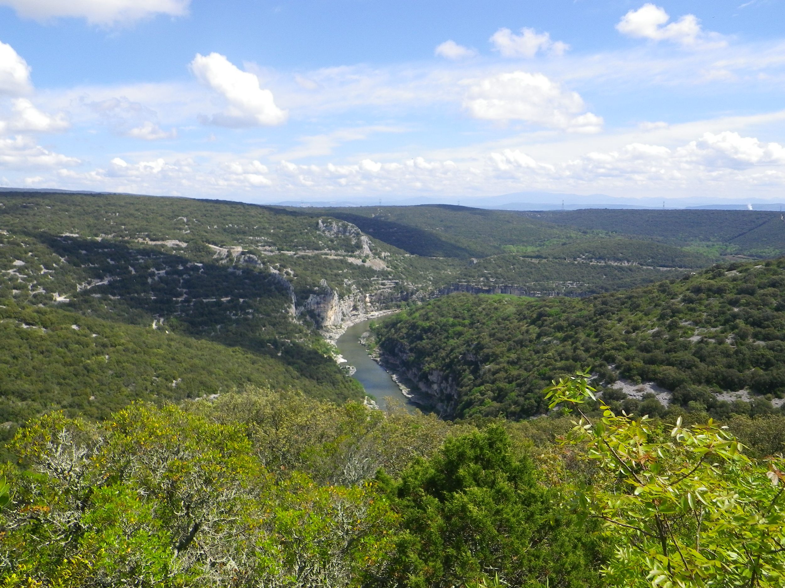 Randonnée passant en surplomb des derniers méandres des gorges de l’Ardèche, offrant un intéressant point de vue sur les collines gardoises.