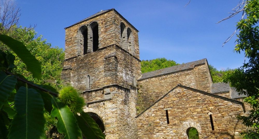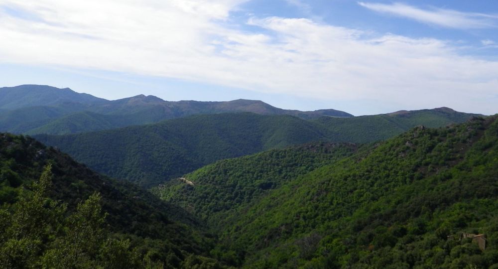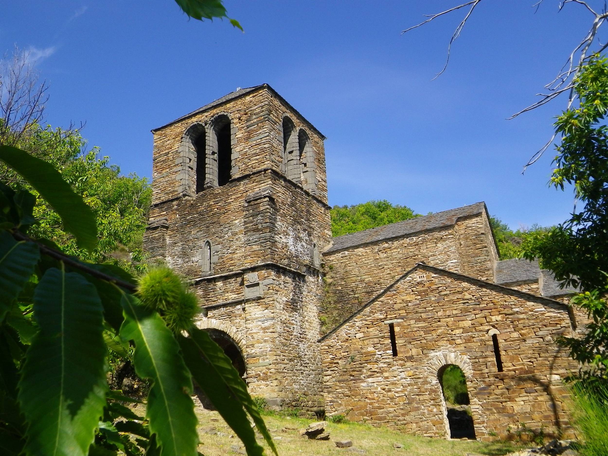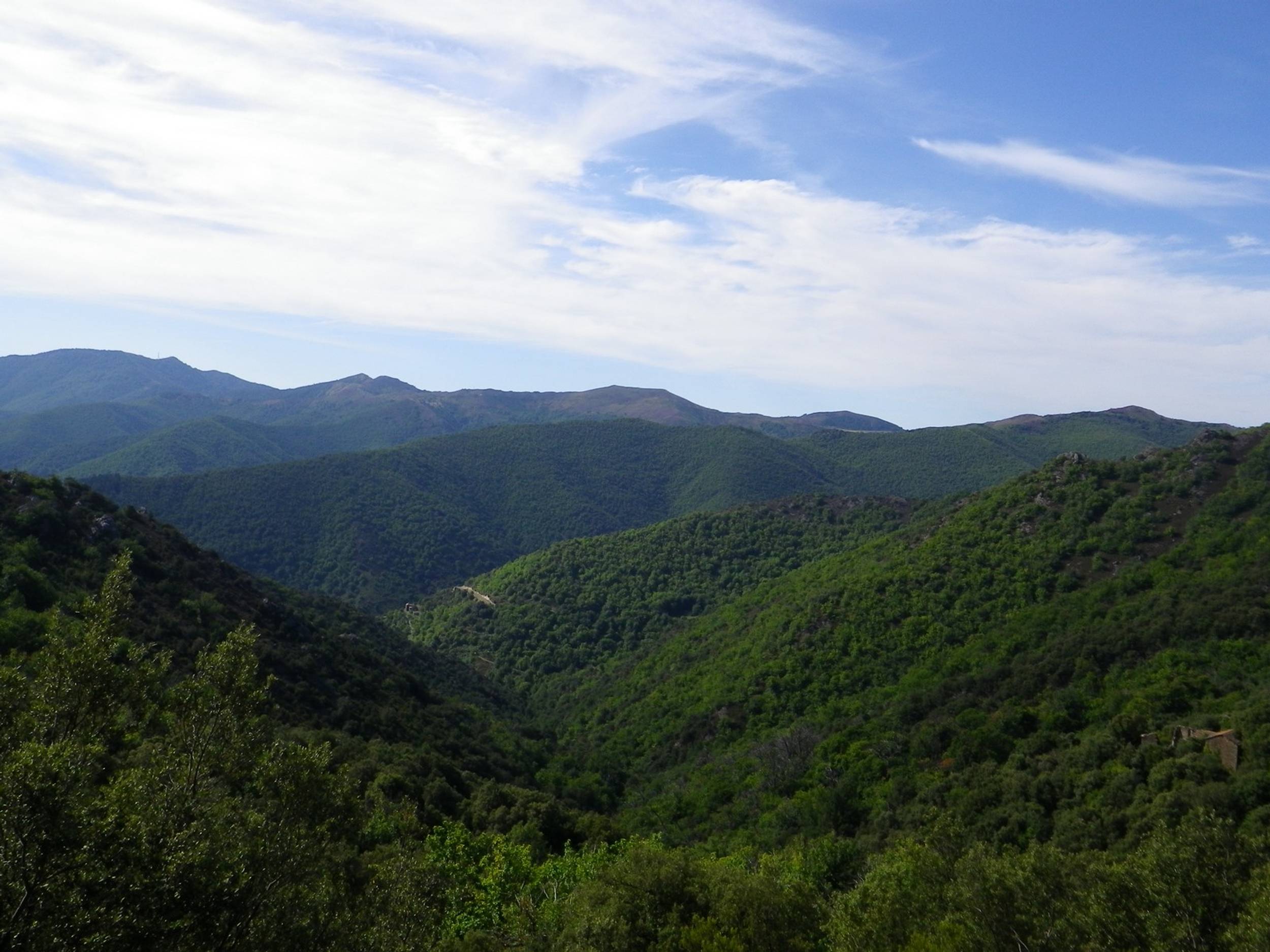Après avoir dépassé, à moitié cachée dans la végétation, l’église, quel plaisir de cheminer sur cette crête, entre châtaigniers et landes, puis de plonger dans ce valat hérissé de dalles schisteuses.