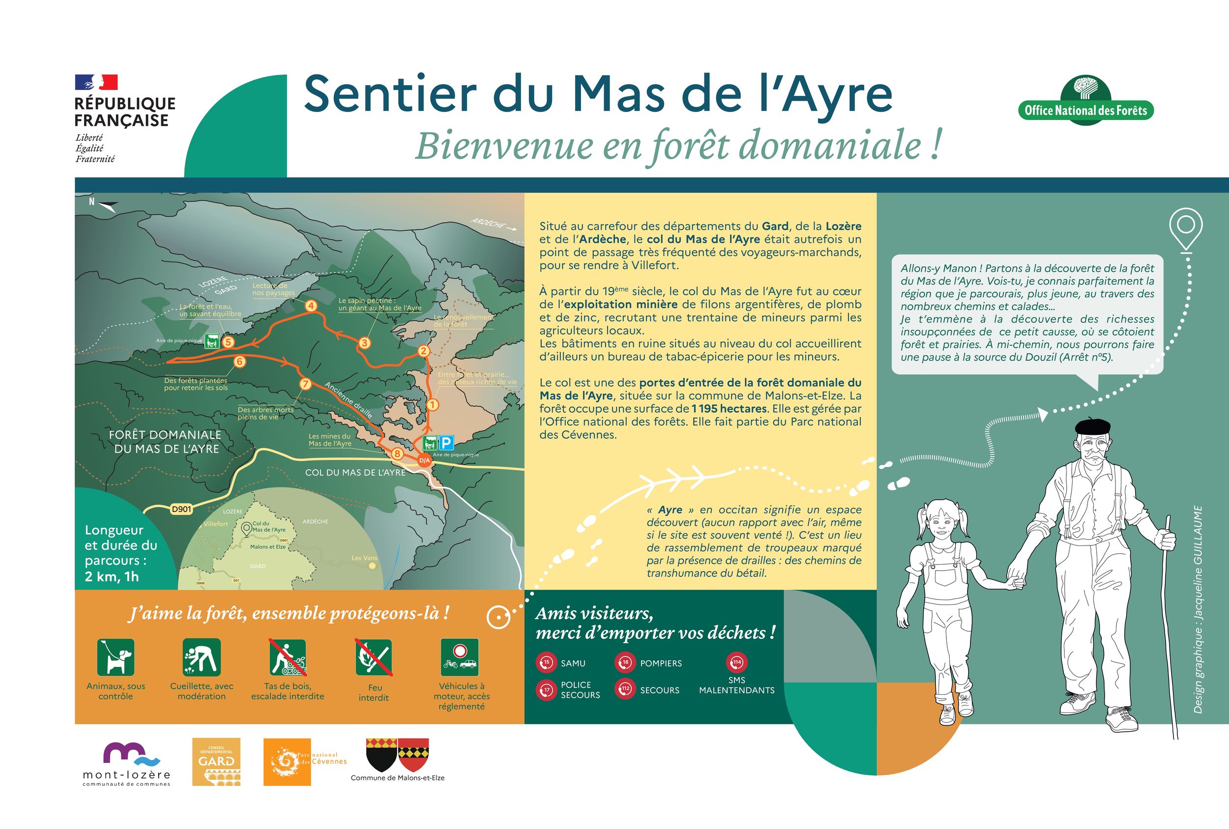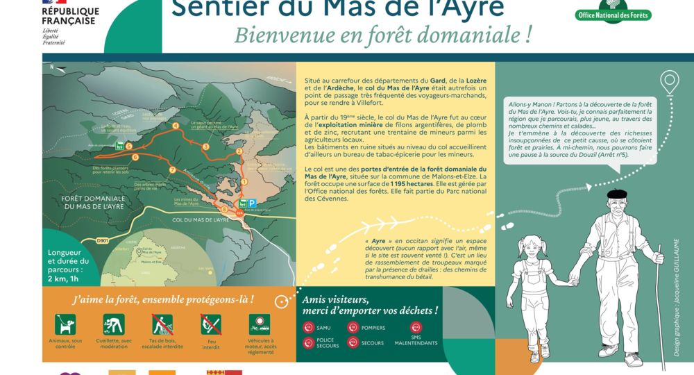 Un parcours instructif à faire en famille. La forêt domaniale du Mas de l’Ayre, plantée à la fin du XIXe siècle à l’époque du grand reboisement régional, alterne avec des coins de prairies ouvertes. Ensemble, ces deux milieux offrent le gîte, le couvert et des possibilités de reproduction à une faune locale variée. Devenez incollables sur les cycles de la vie forestière ainsi que sur l’histoire minière qui a longtemps marqué ce petit territoire.