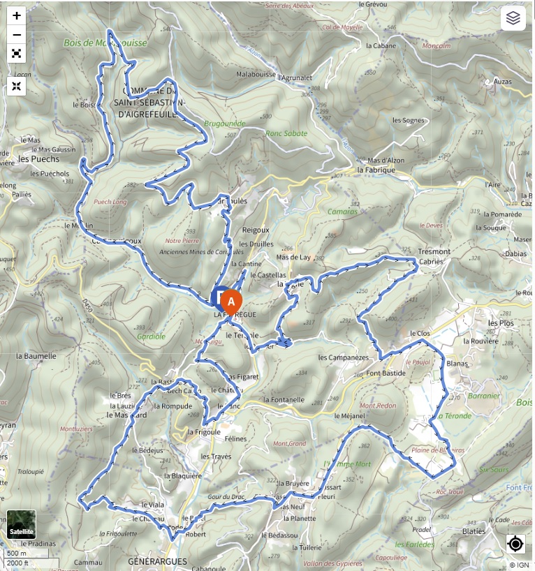 Le circuit commence à Campeyrigous, Camplone, Brugaunède, Carnoulès, La Carrière, Le Quérier, Le Faou, La Vigne, Cabriès, La Cabanette, Plaine de Blateiras, Générargues, Mas Icard, Puech Camp, Mas des Sources, l’Eglise.