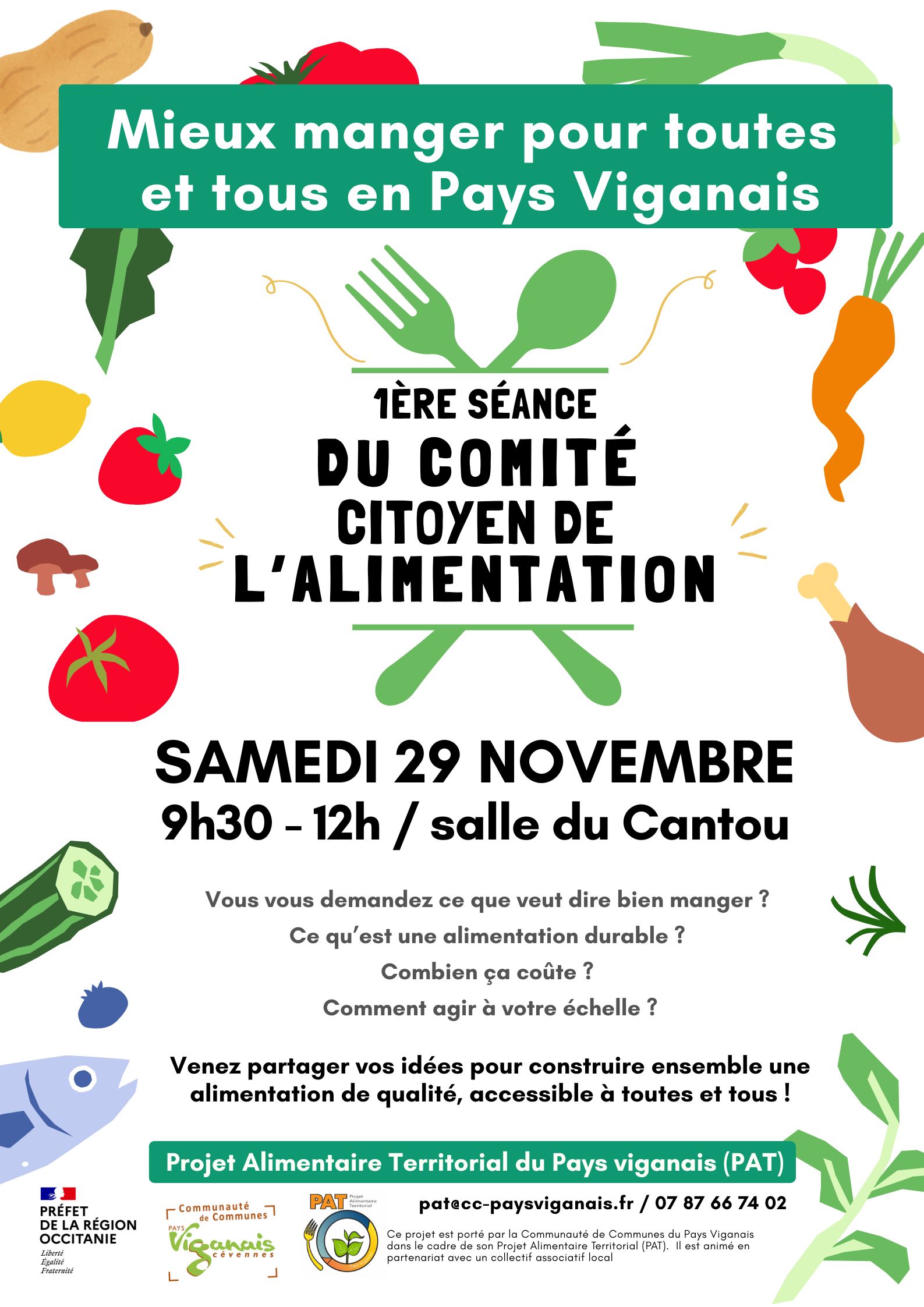 Le programme A partir de 9h30 : Accueil café-papote 10h : Présentation rapide des ateliers 10h15 à 10h45 : Petit brise-glace pour faire connaissance ! 10h45 à 12h : Ateliers thématiques autour du Comité Citoyen Qu’est-ce que c’est ? Comment veut-on que ça fonctionne ? Sur quoi veut-on travailler ? A partir de 12h : Confection d’un apéritif et petit buffet de clôture Rencontre, écoute, partage et découverte seront les maîtres-mots de cette demi-journée. La parole vous sera donnée tout au long des ateliers pour construire un comité qui vous ressemble ! Ouvert à toutes et à tous ! Votre présence sur cette 1ère séance n’est pas synonyme d’un engagement définitif, vous pourrez choisir de poursuivre ou non cette aventure. Alors curieuses et curieux, n’hésitez plus ! Des questions ? Contactez le Projet Alimentaire Territorial (PAT) : pat@cc-paysviganais.fr / 07 87 66 74 02