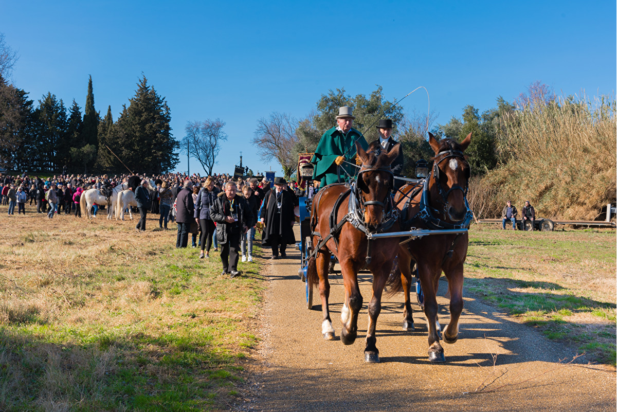 – Vers 10h30 : Procession depuis la cour de la cave coopérative voisine. Elle est emmenée par Saint-Vincent, patron des vignerons, sur son attelage, suivi d’une farandole de confréries, de cigaloun, de dames en costumes d’Arles, de gardians à cheval, d’un groupe musical et surtout du public fervent !
