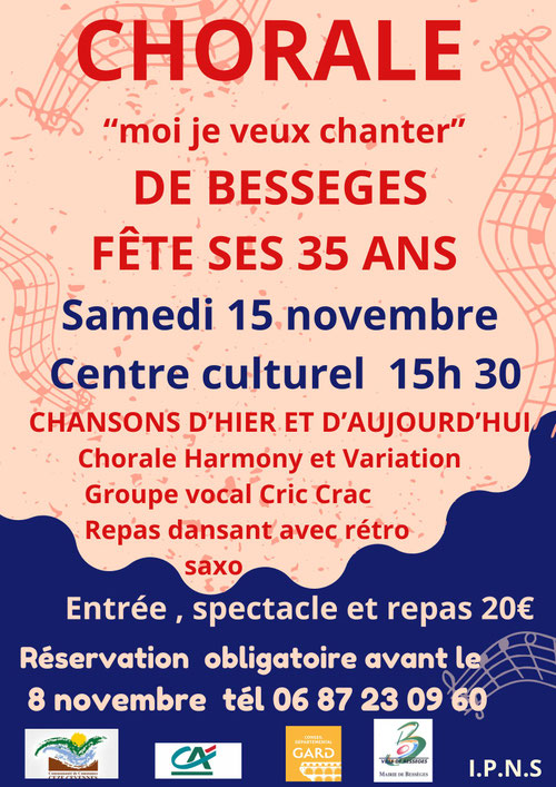 La chorale « Moi je veux chanter » de Bessèges fête ses 35 ans le samedi 15 novembre à 15h30 au centre culturel, avec un programme de chansons d’hier et d’aujourd’hui, suivi d’un repas dansant animé par Rétro Saxo