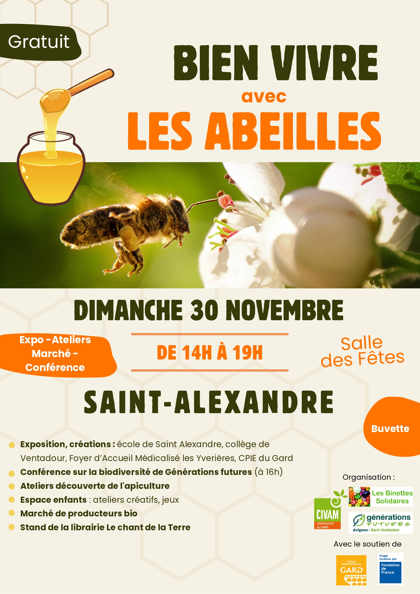 Exposition et créations par l’ école de Saint Alexandre, le collège de Ventadour, le Foyer d’Accueil Médicalisé les Yverièrese et CPIE du Gard Conférence sur la biodiversité de Générations futures (à 16h) Ateliers découverte de l’apiculture Espace enfants : ateliers créatifs, jeux Marché de producteurs bio Stand de la librairie Le chant de la Terre
