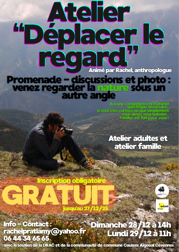 Vous qui vous êtes déjà baladé en nature. Vous qui avez déjà photographié un paysage. Vous qui travaillez la terre. Vous qui aimez la forêt. Venez vous promener en déplaçant votre regard. Accompagnés par Rachel, anthropologue, vous contemplerez et questionnerez votre lien à la nature au travers d’exercices photographiques et de discussions. Nulle besoin d’être photographe ou naturaliste, si vous êtes curieux ou curieuse, que vous souhaitez partager un moment convivial et que vous aimez la nature, venez déplacer votre regard !