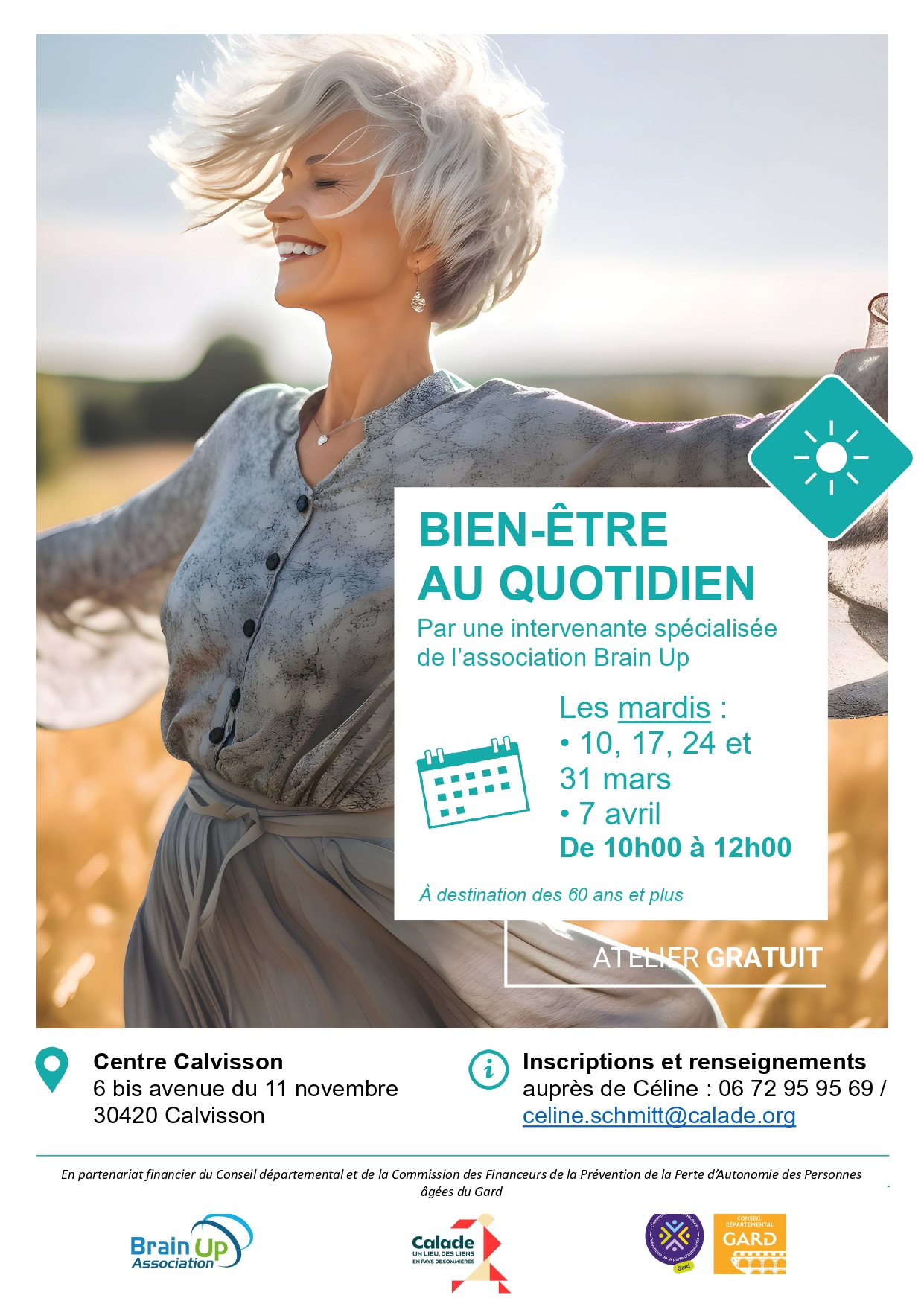 Calade à Calvisson, en partenariat avec Brain Up Association, organise un atelier « Bien-être au quotidien » destiné à favoriser l’équilibre entre le corps et l’esprit.