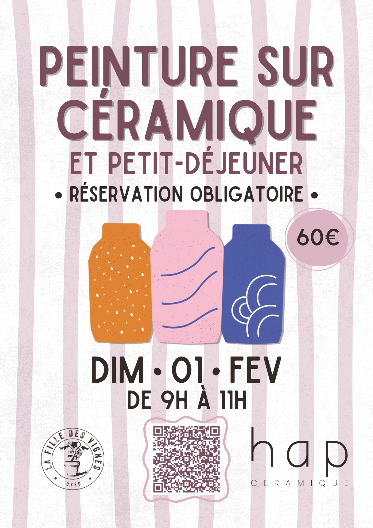 Rejoignez Charlotte d’@hap_ceramique pour un atelier de peinture sur céramique, autour d’un petit-déjeuner gourmand comprenant une boisson chaude, un croissant et un jus de fruit…