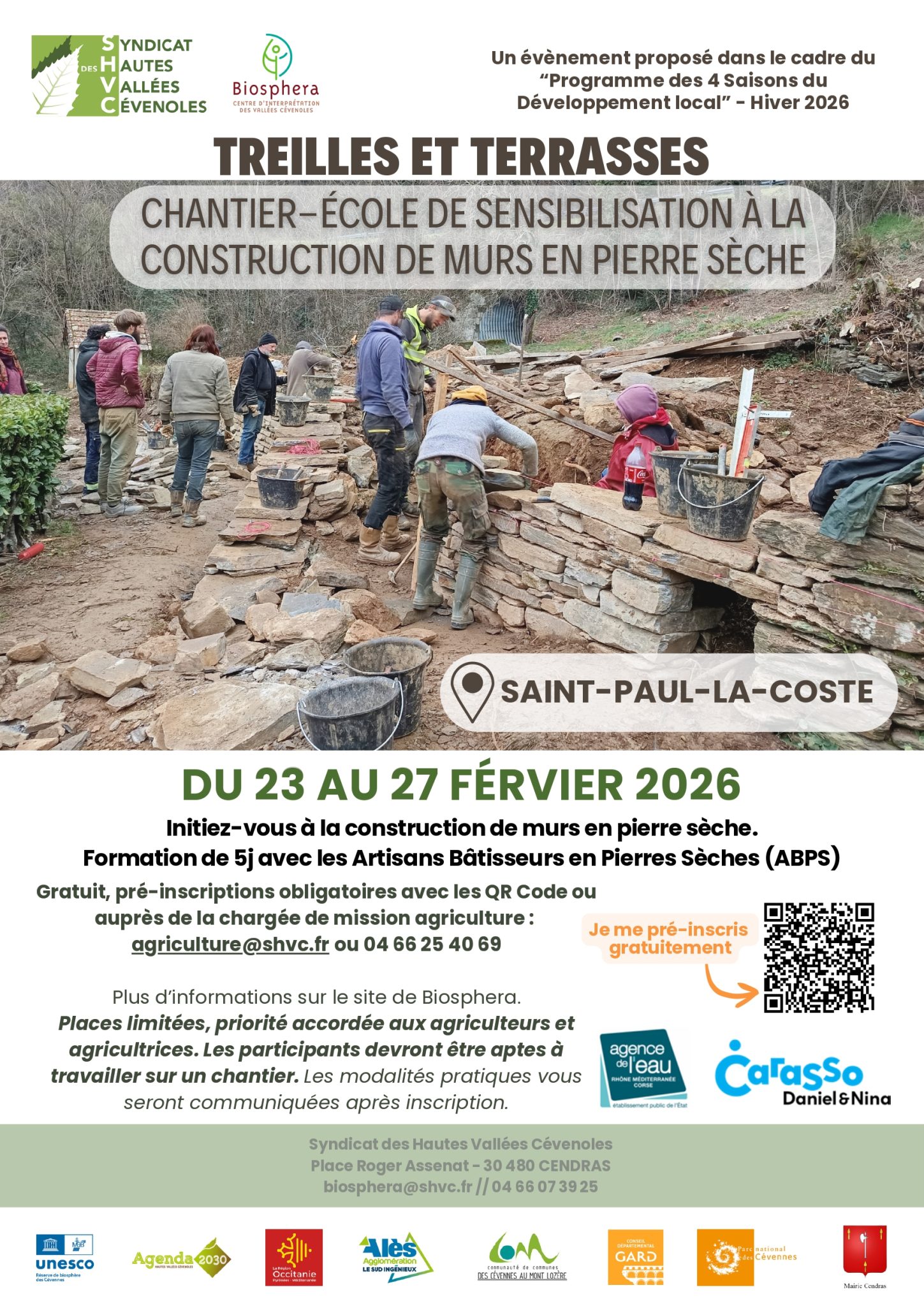 Durant 5 jours d’initiation avec 2 Artisans Bâtisseurs en Pierre Sèche, apprenez les bases de la construction de murets en pierre sèche à Saint-Paul-la-Coste. Ces journées sont destinées en priorité aux agriculteurs ou porteurs de projet agricole.
