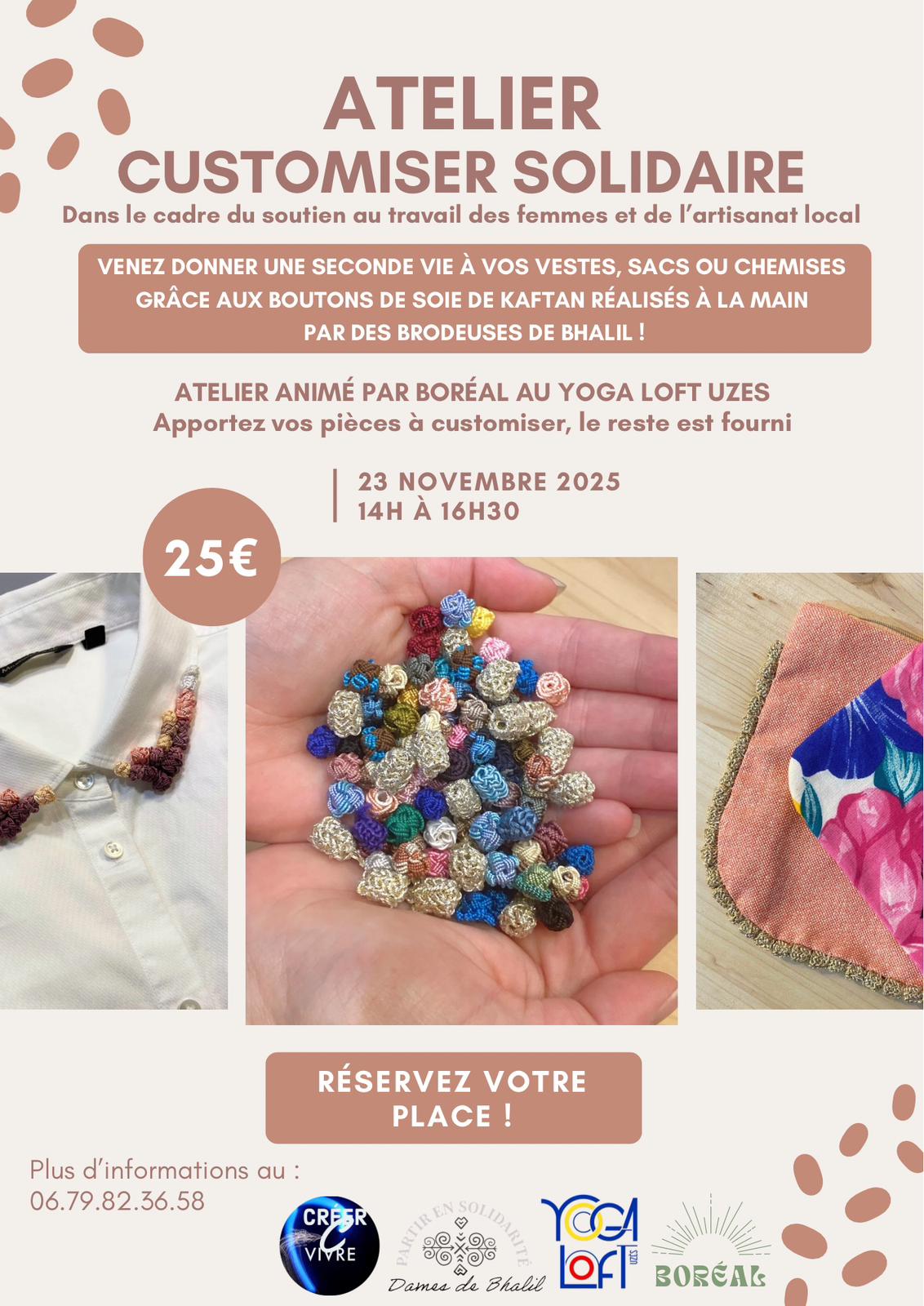 Venez donner une seconde vie à vos vestes, sacs ou chemises, grâce aux boutons de soie de caftan réalisés à la main par des brodeuses de Bhalil. Cet atelier est atelier organisé dans le cadre du soutien au travail des femmes et de l’artisanat local.