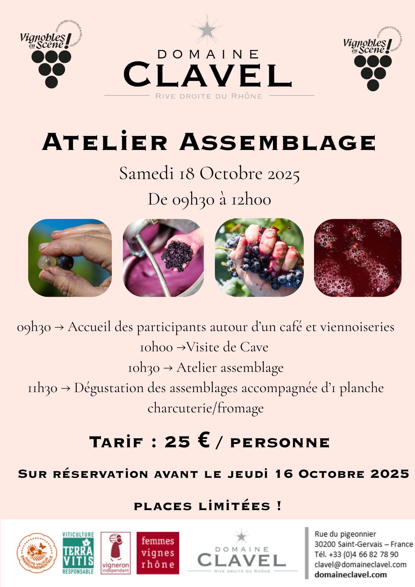 Dans le cadre de des journées Vignobles et Découverte – Vignobles en scène, participez à un atelier d’assemblage au coeur du Domaine Clavel, dégustez les assemblages avec des planches de charcuterie, fromages, échangez avec le vigneron, visitez la cave