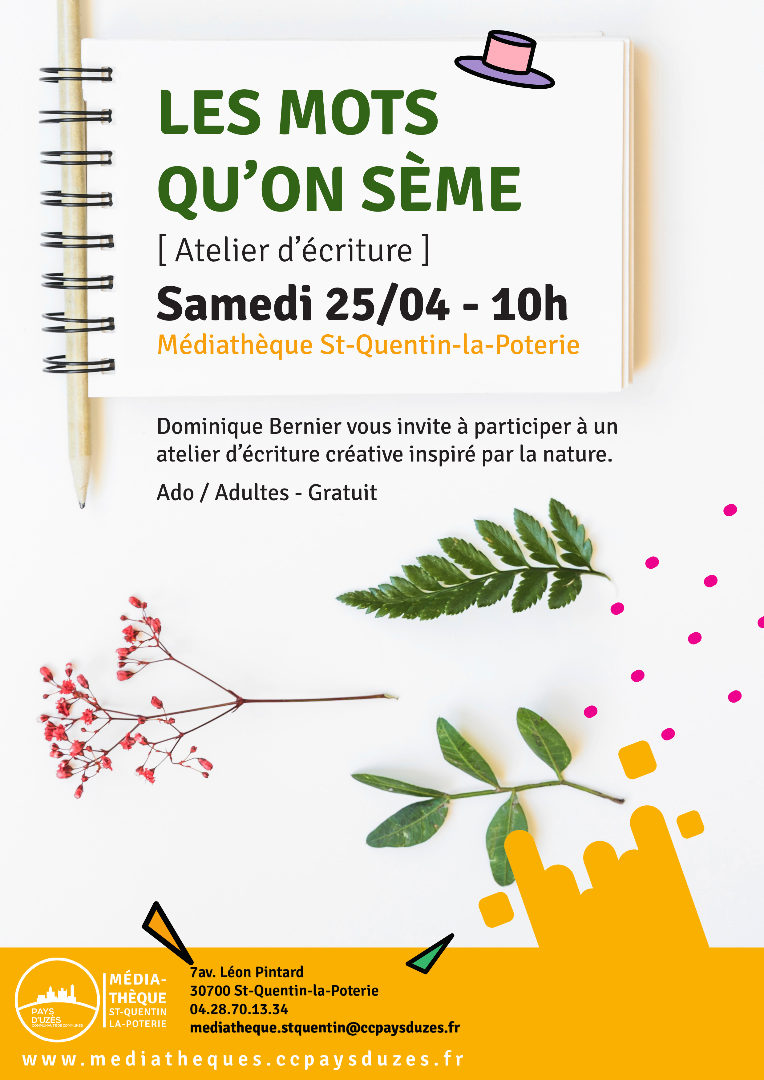 Dominique Bernier vous invite à participer à un atelier d’écriture créative inspiré par la nature.Depuis toujours la nature n’a cessé d’inspirer les écrivains et, à votre tour, nous vous invitons à laisser les muses sylvestres titiller votre imagination.