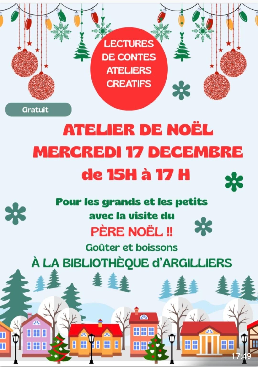 La bibliothèque sera bien animée ! Venez participer à un atelier créatif spécial Noël et écouter des contes.Goûter gourmand à partager : vive Noël à la bibliothèque d’Argilliers ! Aucune inscription et tout est gratuit. Bienvenue à tous !