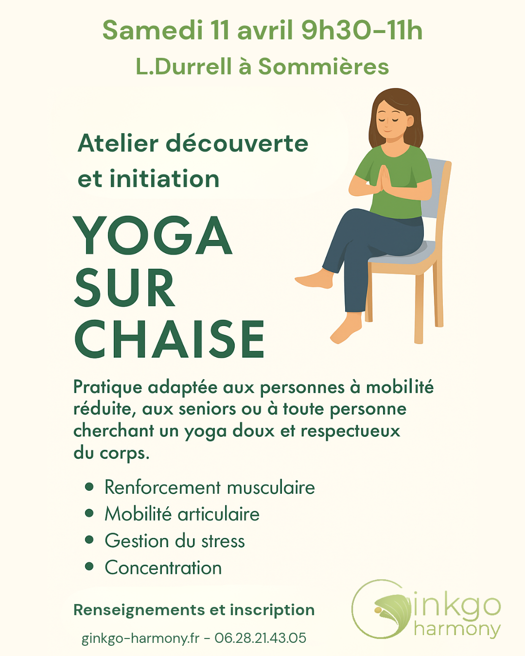Venez decouvrir le yoga sur chaise ! C’est une pratique douce et accessible qui utilise une chaise comme support pour effectuer des mouvements et postures favorisant flexibilité, force musculaire, équilibre et réduction du stress ; idéal pour débutants, personnes âgées ou en position assise prolongée, et adaptable selon les capacités pour améliorer la mobilité et la qualité de vie.