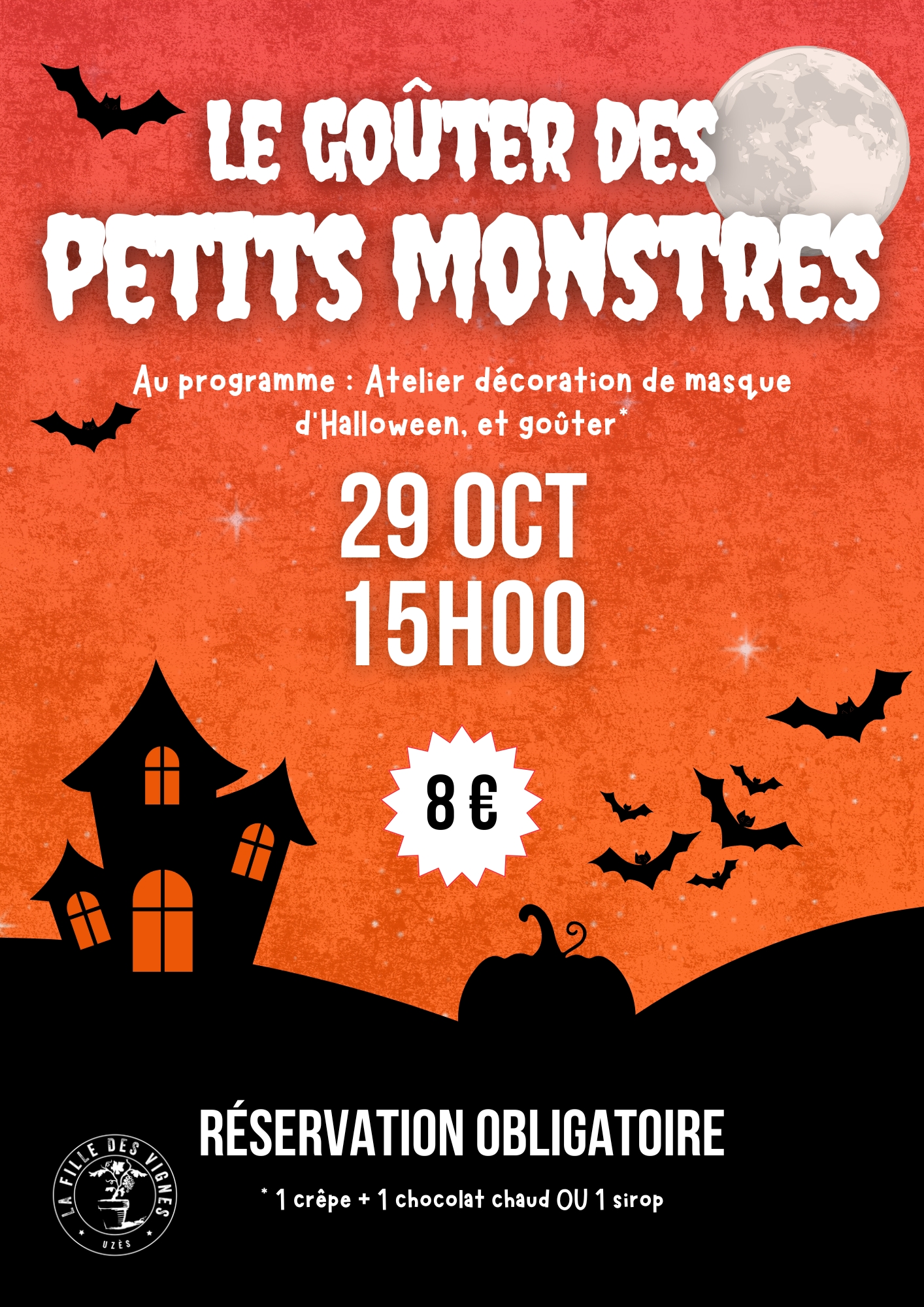 Le café La fille des vignes vous propose un atelier créatif pour enfants : décoration de masques citrouilles avec peintures, stickers et goûter inclus. Un moment ludique et convivial à partager en famille avant Halloween. Réservation obligatoire.