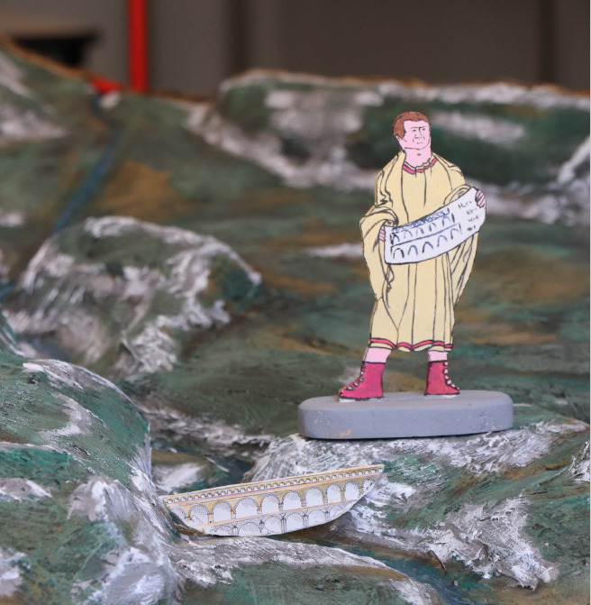 Go ! Mission grands travaux pour conduire l’eau ! Tracez l’aqueduc avec la groma et ses visées à angle droit.Après quoi, horizontalement installé, le chorobate livrera tous ses secrets pour mesurer la pente en dénivelée.
