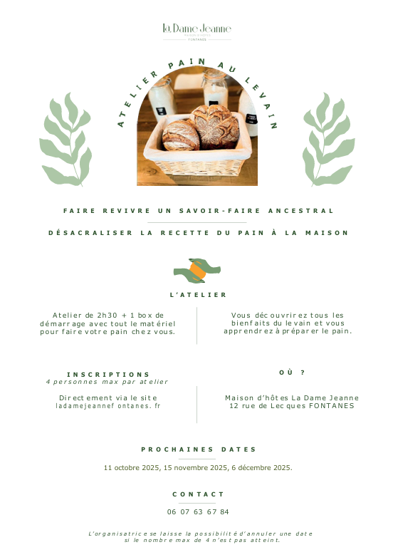 Cet atelier comprend 1 atelier de 2h30 et 1 kit de démarrage pour faire votre pain chez vous.