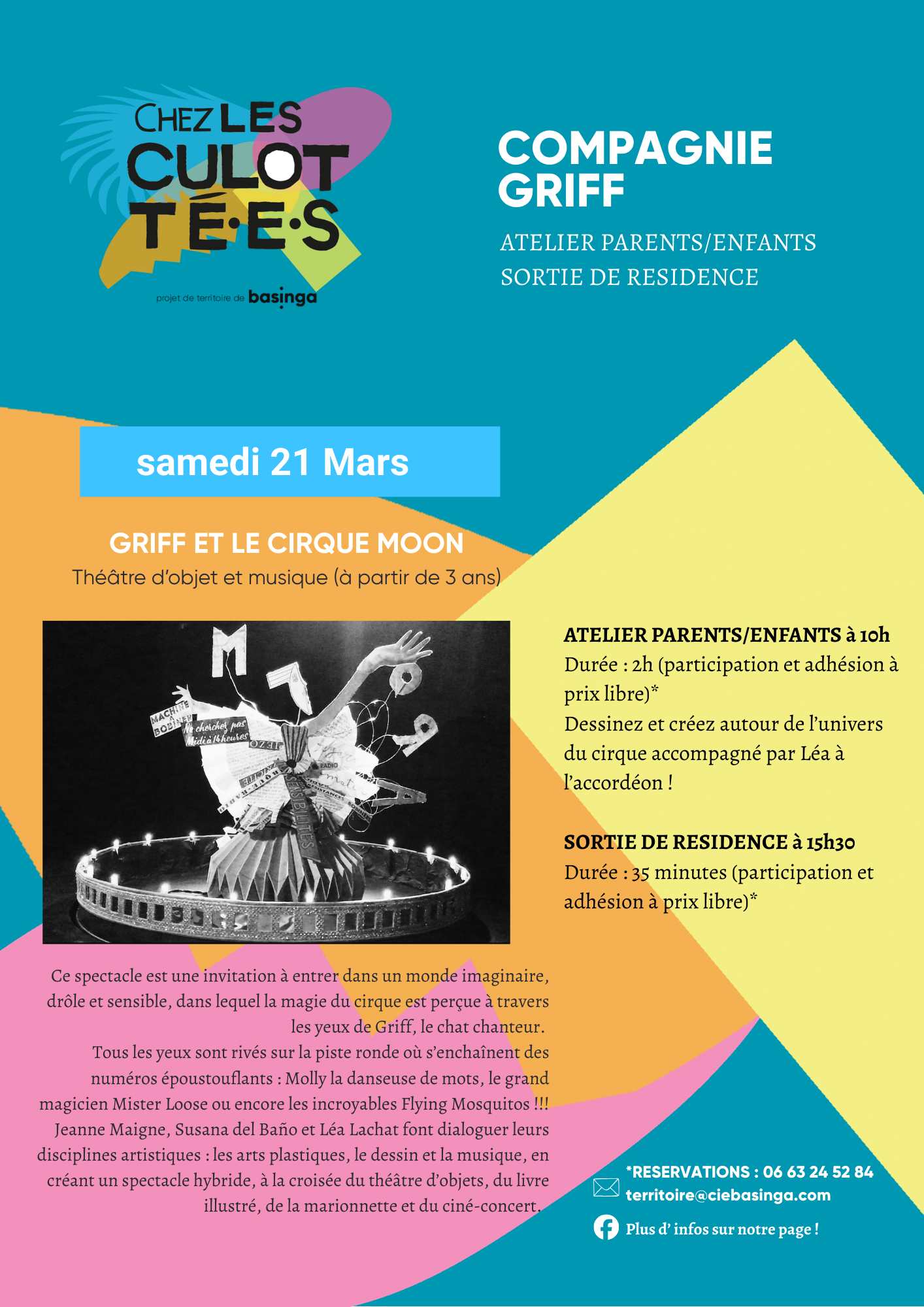 SORTIE DE RESIDENCE à 15h30 Durée : 35 minutes Ce spectacle est une invitation à entrer dans un monde imaginaire, drôle et sensible, dans lequel la magie du cirque est perçue à travers les yeux de Griff, le chat chanteur. Tous les yeux sont rivés sur la piste ronde où s’enchaînent des numéros époustouflants : Molly la danseuse de mots, le grand magicien Mister Loose ou encore les incroyables Flying Mosquitos !!