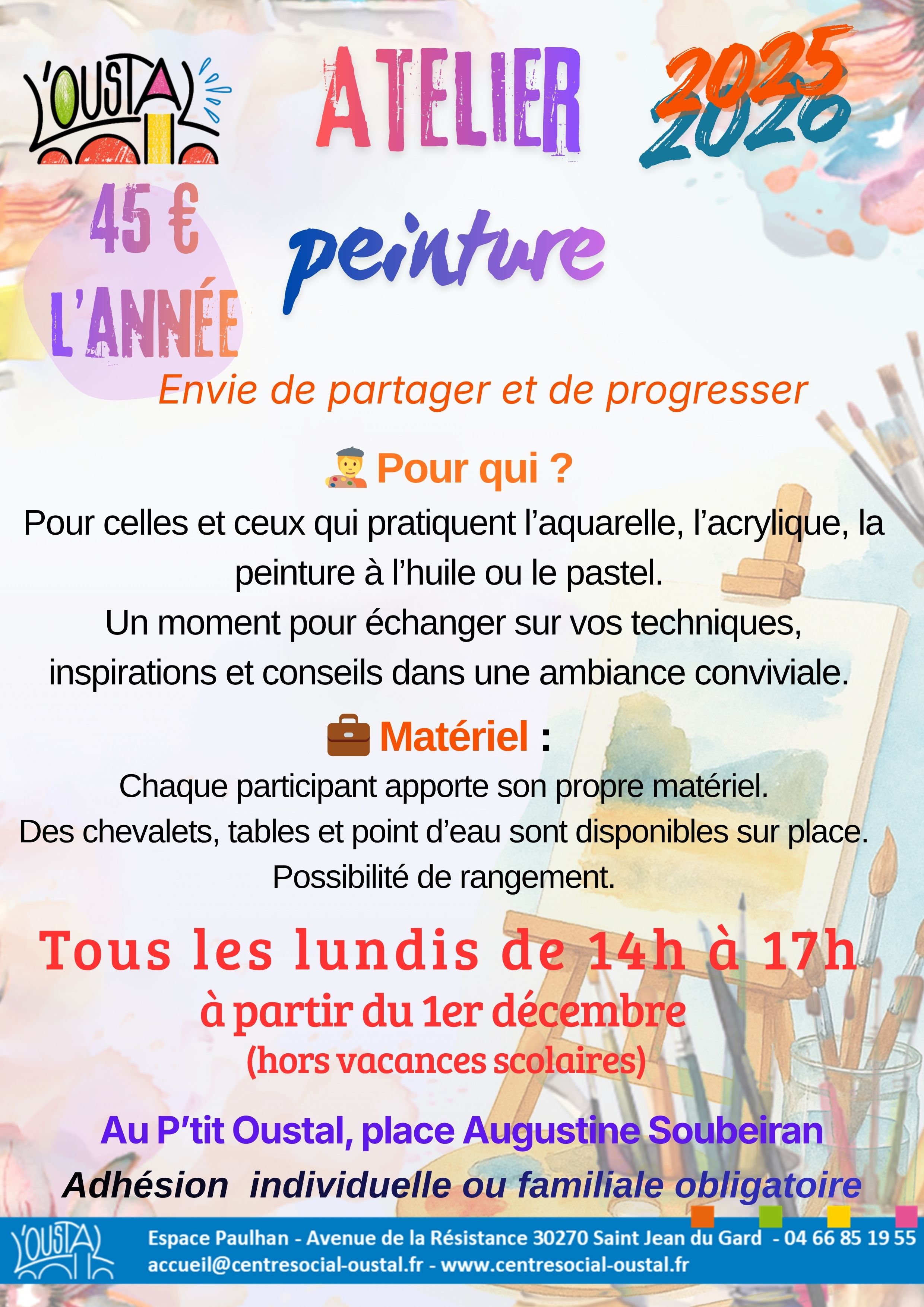 L’Oustal propose un atelier peinture pour partager et progresser dans la pratique de l’aquarelle, l’acrylique, la peinture à l’huile ou encore le pastel. Vous partagerez vos techniques, inspirations et conseils dans une ambiance conviviale.