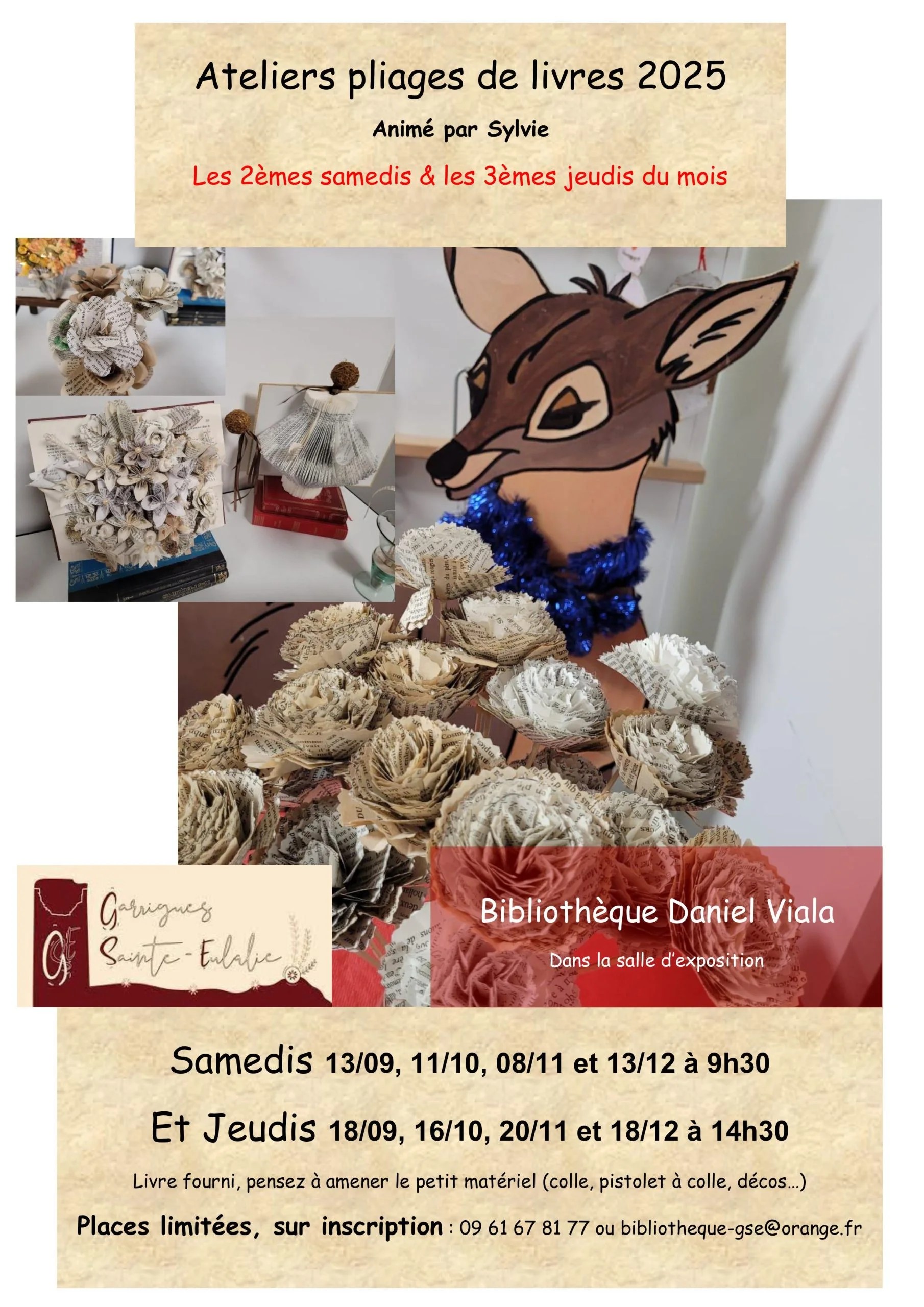 Sylvie Gignon, bénévole à la bibliothèque, vous propose de donner une seconde vie aux livres, par la création de différentes décorations surprenantes : livres ouverts, suspensions, anges, fleurs, bougeoirs…