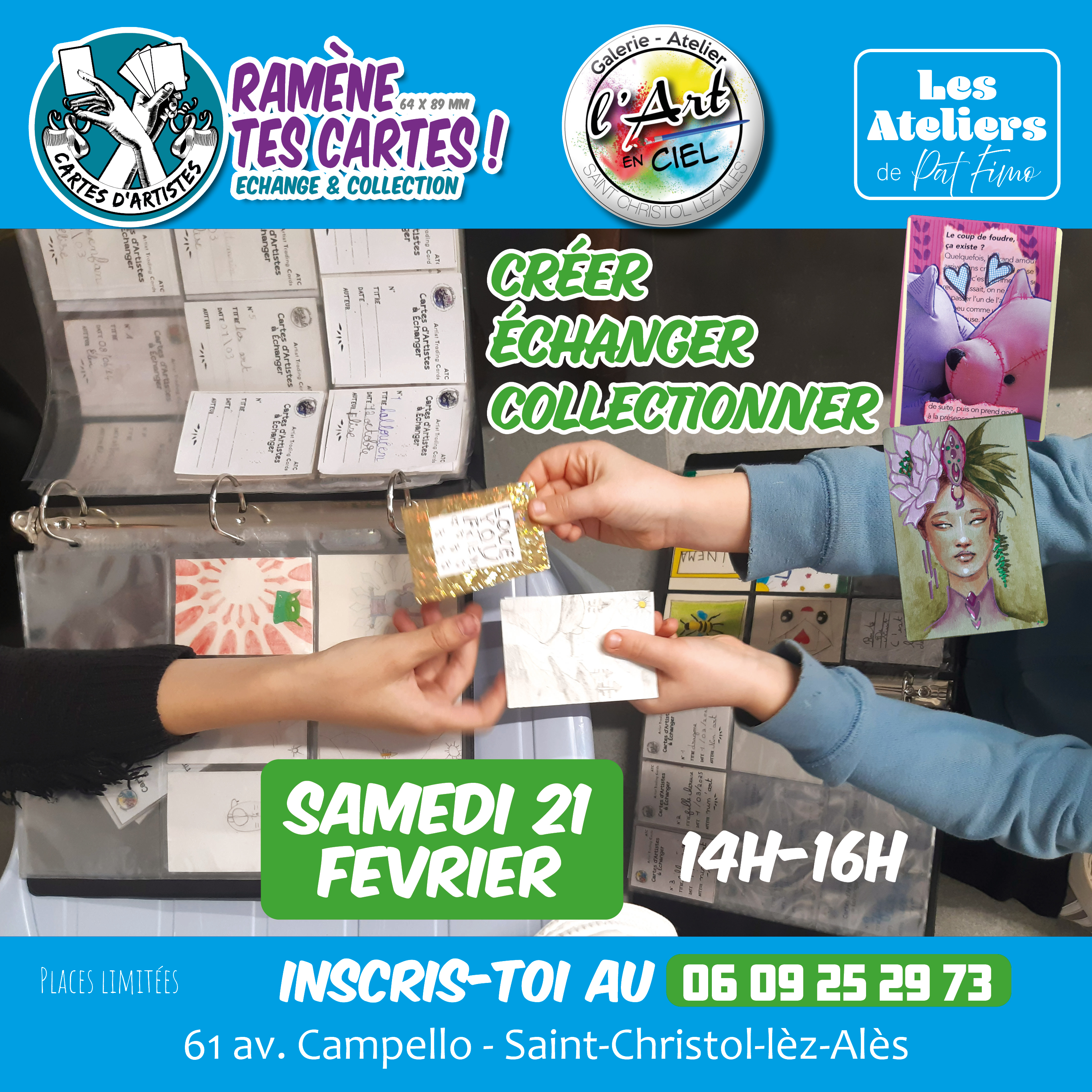 Ateliers de créations artistiques sur des cartes 64×89 mm (ATC Artist Trading Cards). Tout public. Matériel fourni. Atelier animé par l’artiste Pat Fimo.