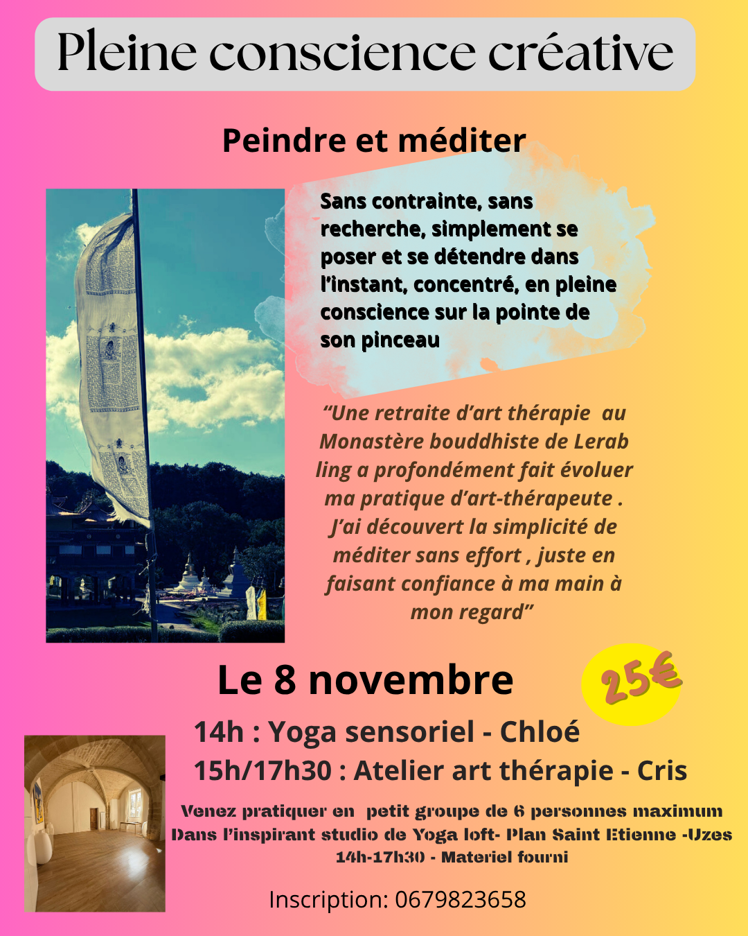 Ateliers animés par Chloe Le Trieu Tuong (yoga) et Cris Joguet (art intuitif) : 14 h : Yoga sensoriel. 15 h – 17 h 30 : Atelier art thérapie.