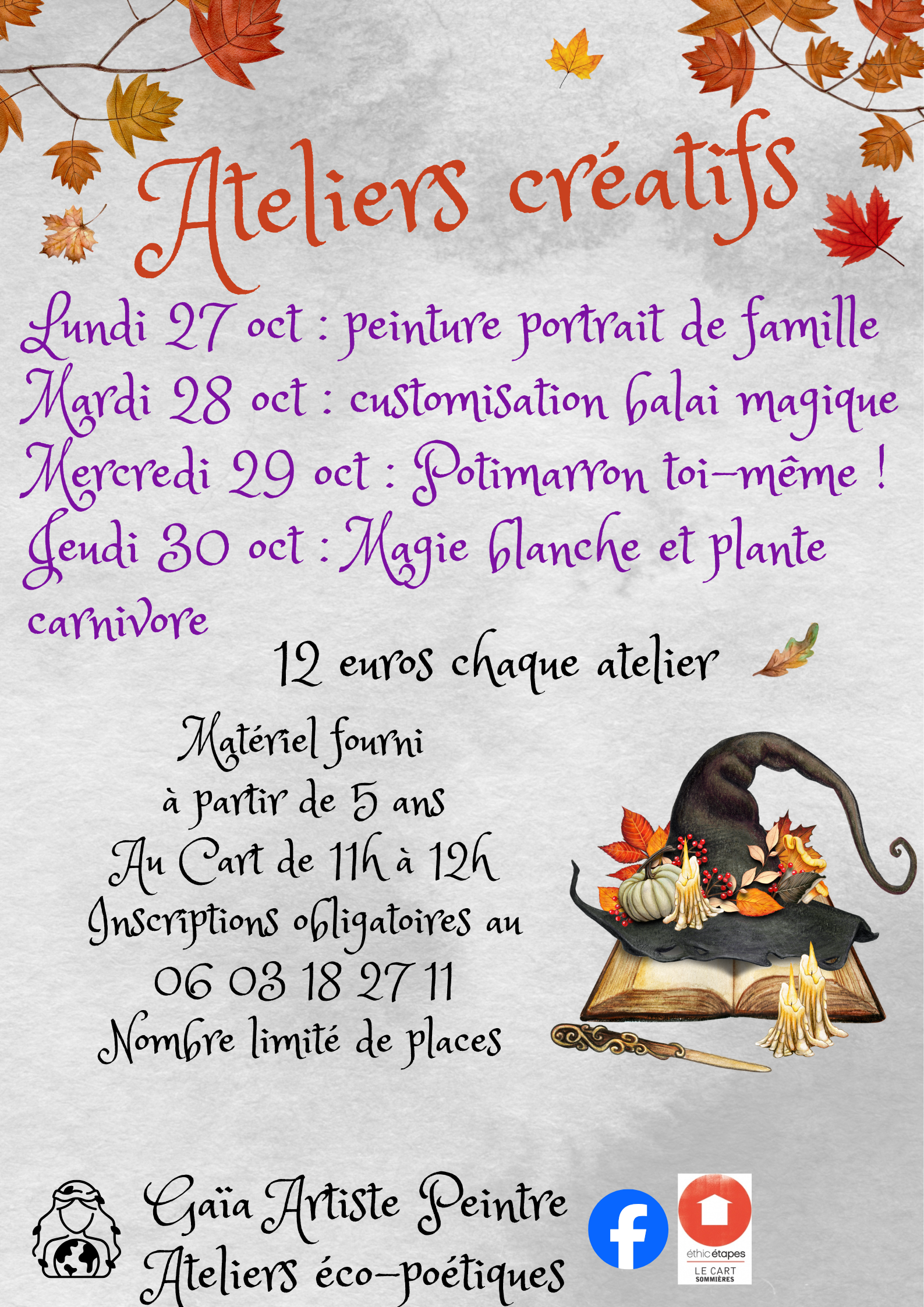 Ateliers créatifs pour les enfants à partir de 5 ans+, 11h-12h, 12€/atelier, matériel fourni. Expo possible le 31/10. Places limitées. Infos/résa : 06 03 18 27 11.