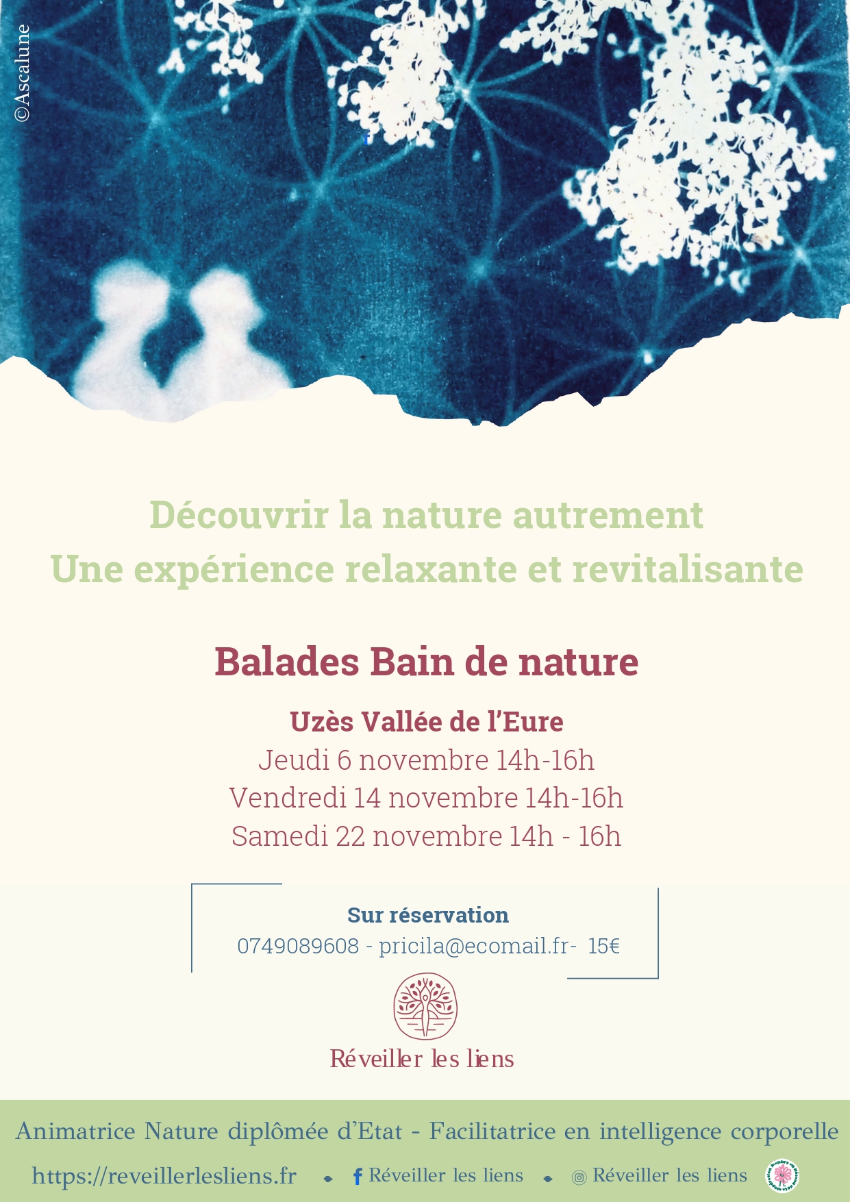 Inspiré par le Shirin Yoku (bains de forêt japonais), la sylvothérapie, et des pratiques corporelles (Qi Qong, eurythmie, yoga, méditation…), le bain de nature permet de bénéficier pleinement des bienfaits de la nature et de se reconnecter à son corps et à la nature, avec tous ses sens, plus que lors d’une simple marche. Les suggestions au fur et à mesure vous invitent à ralentir et à prêter vraiment et pleinement attention à ce qui se passe en vous et autour de vous.