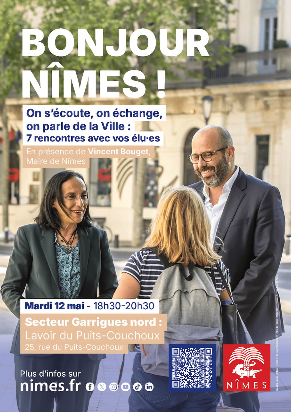 Participez à “Bonjour Nîmes”, une série de sept rencontres avec le maire et les élu.es de quartier pour vous écouter et co-construire la ville ensemble. Rendez-vous le mardi 12 mai à 18h30. Prenez date pour échanger.
