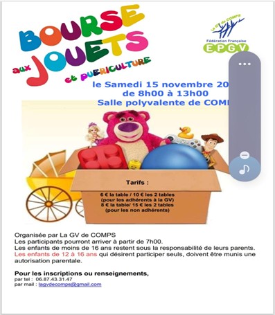 L’association La Gym Volontaire de Comps organise une bourse aux jouets et à la puériculture. Profitez-en pour trouver des jeux et jouets pour Noël !