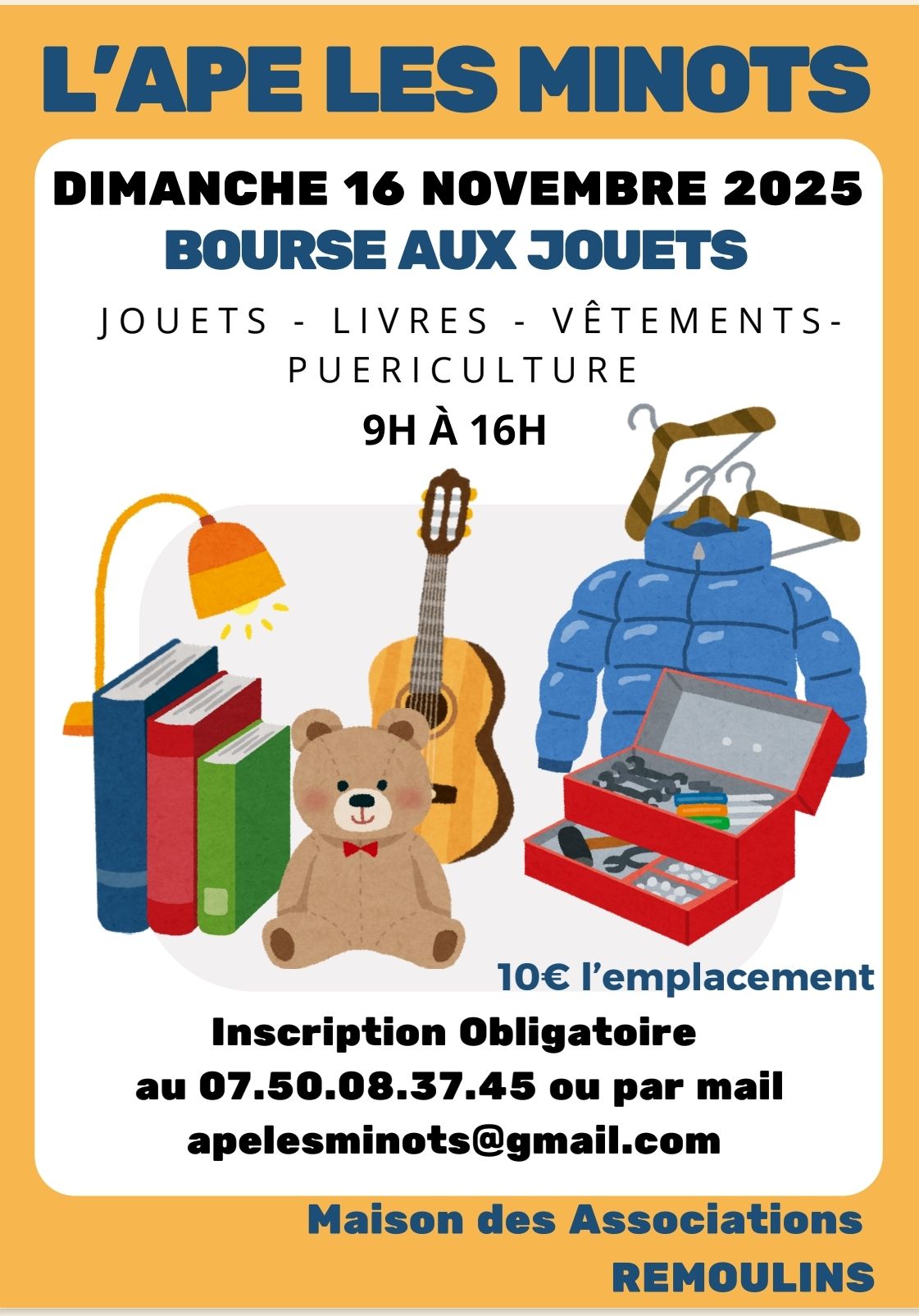 L’APE Les minots organise sa bourse aux jouets et à la puériculture. Une belle occasion de donner une seconde vie aux jouets et de faire des heureux !On vous attend nombreux pour partager ce moment convivial