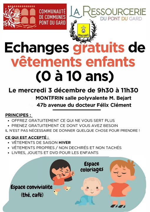 Besoin de renouveler la garde-robe de vos enfants ? Vous avez des vêtements 0-10 ans qui encombrent vos placards ? Participez à la matinée d’échanges de vêtements organisée par la Ressourcerie du Pont du Gard et la Communauté de communes du Pont du Gard.