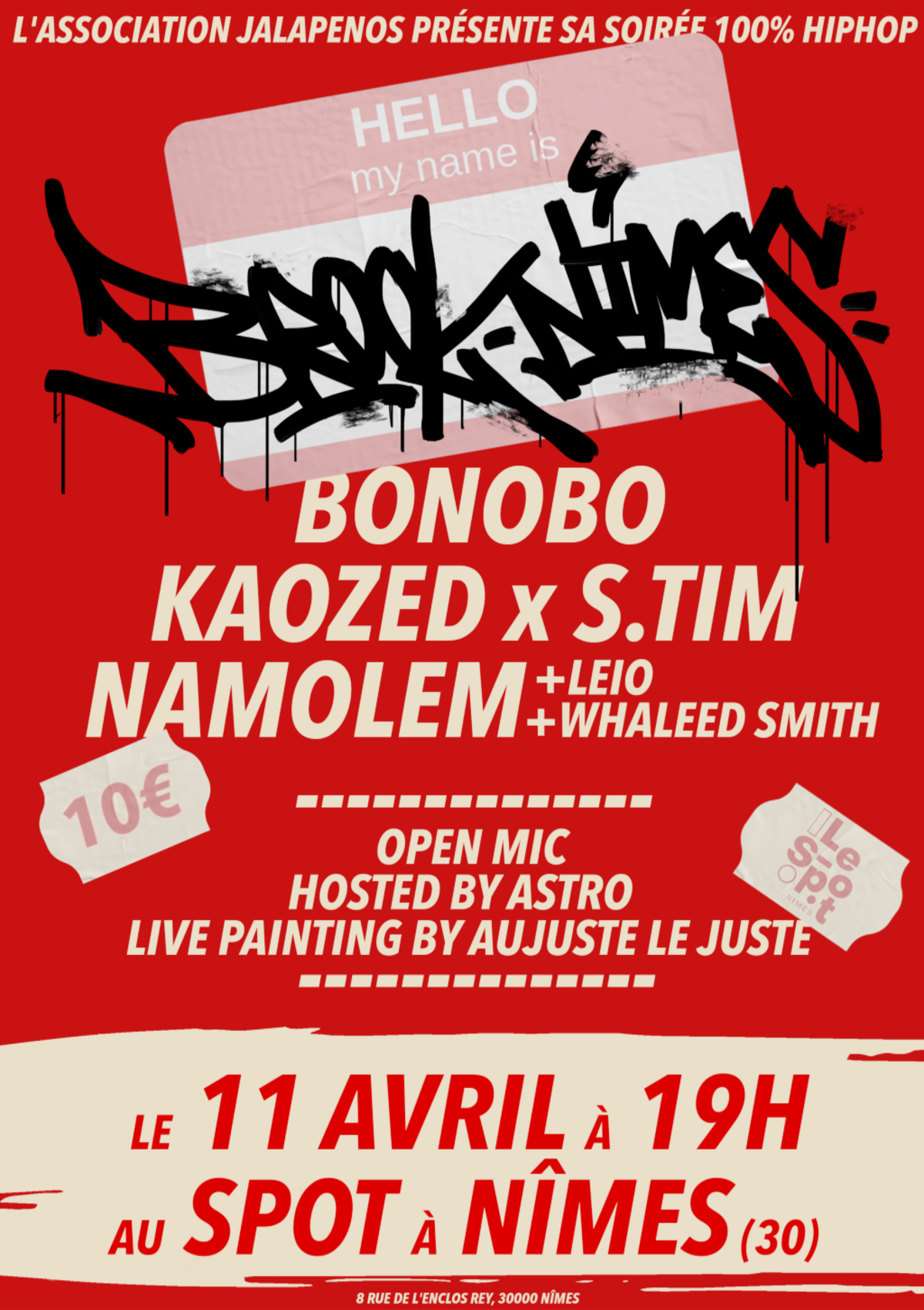 L’association Jalapenos est de retour pour vous présenter sa première soirée de l’année 2026 intitulée “Brooknîmes”, où peintres et rappeurs de notre régions se rejoignent pour faire le show en mode 100% HipHop !