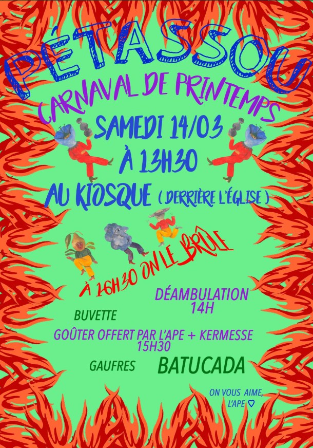 Le programme de l’après-midi : Dès 14h, une déambulation dans les rues pour lancer les festivités. À partir de 15h30, goûter offert par l’APE, kermesse, gaufres et batucada pour mettre le feu à la fête ! Et à 16h30, Le Petassou sera brûlé ! Buvette sur place.