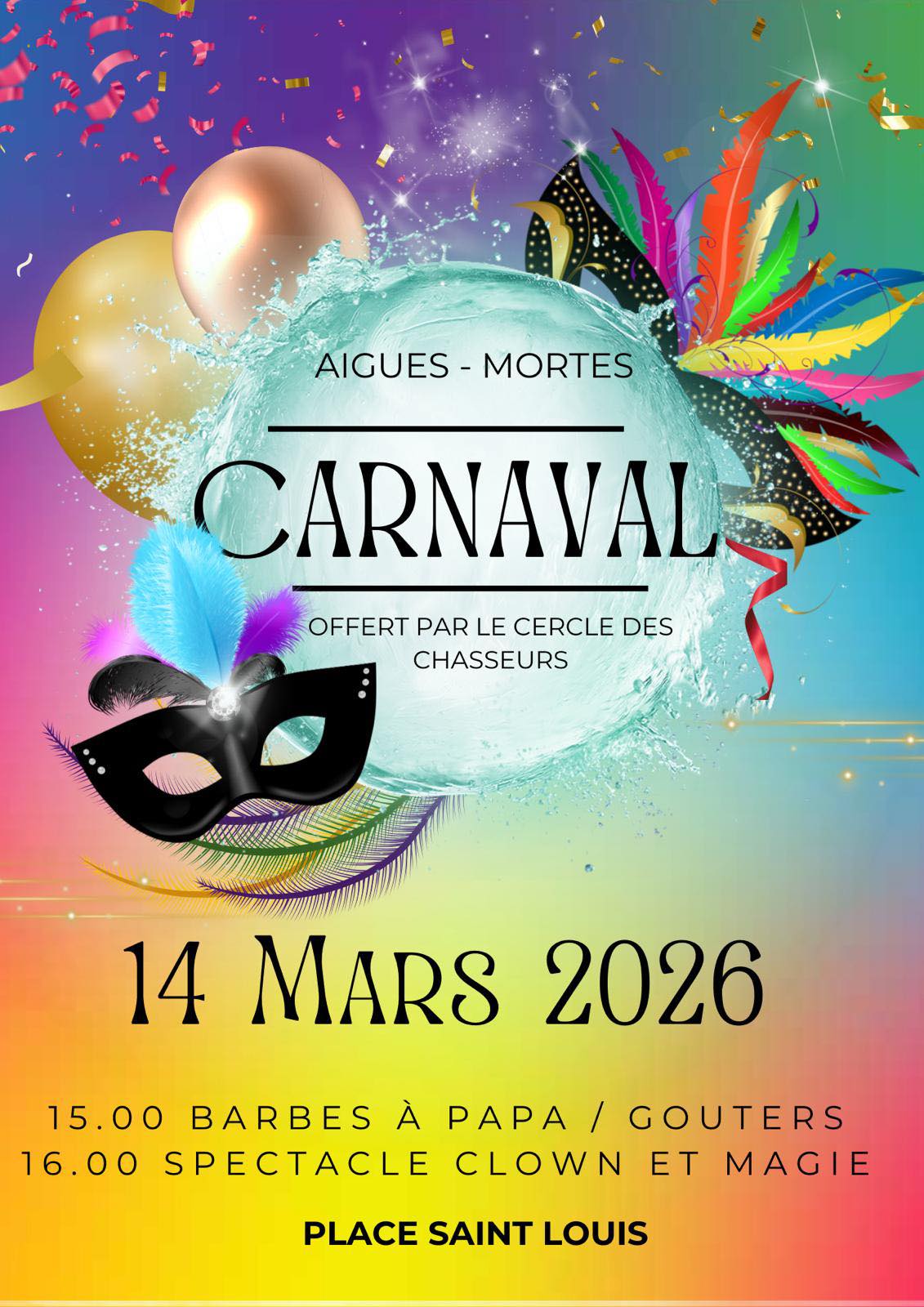 Le Cercle des chasseurs d’Aigues-Mortes organise son carnaval annuel le 14 mars 2026 sur la place Saint-Louis. Les participants sont invités à venir costumés pour partager un moment festif et convivial.