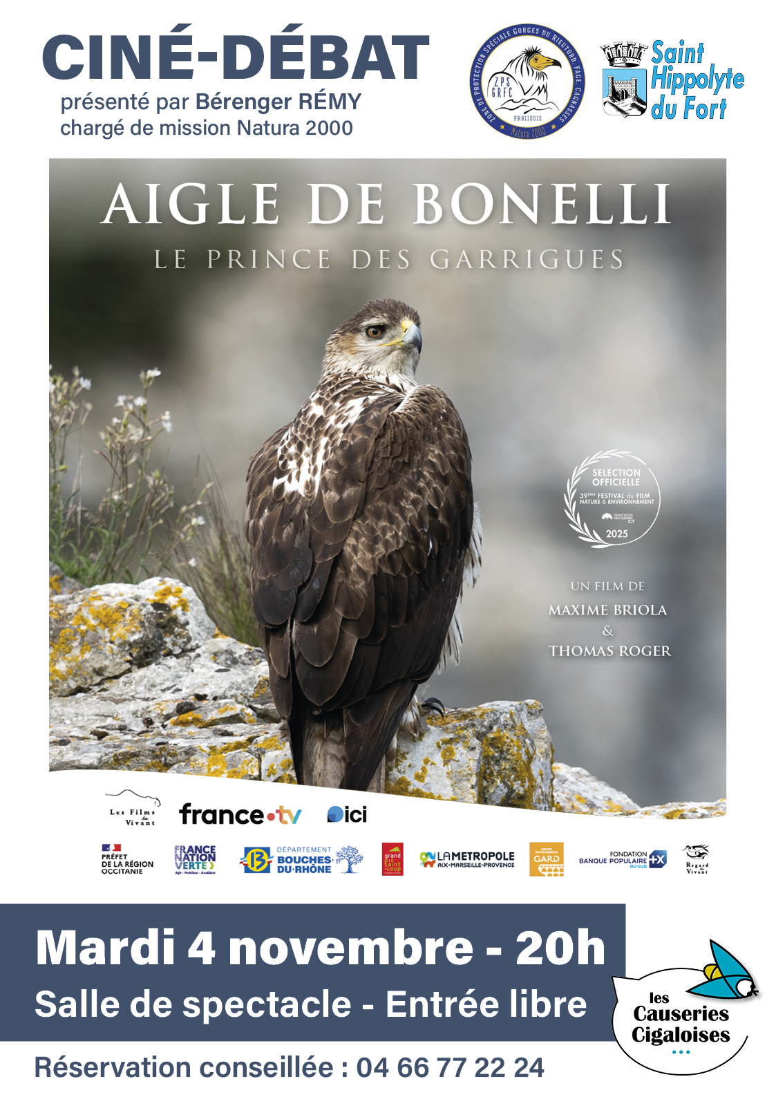 Projection du film : Aigle de Bonelli, le prince des garrigues Documentaire (52 min) réalisé par Maxime Briola et Thomas Roger