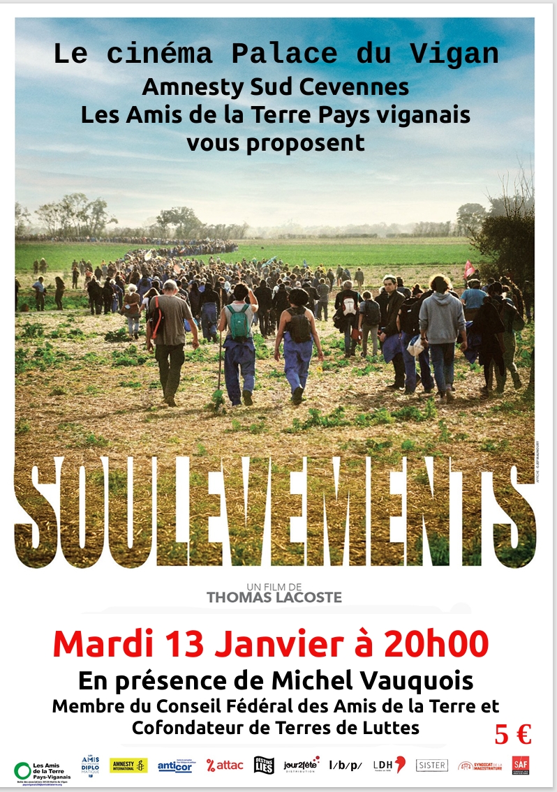 Ciné-débat autour du documentaire de Thomas Lacoste « Soulèvements » en présence de Victor Vauquois des Amis de la Terre, proposé par Amnesty International Sud Cévennes et les Amis de la Terre Pays Viganais