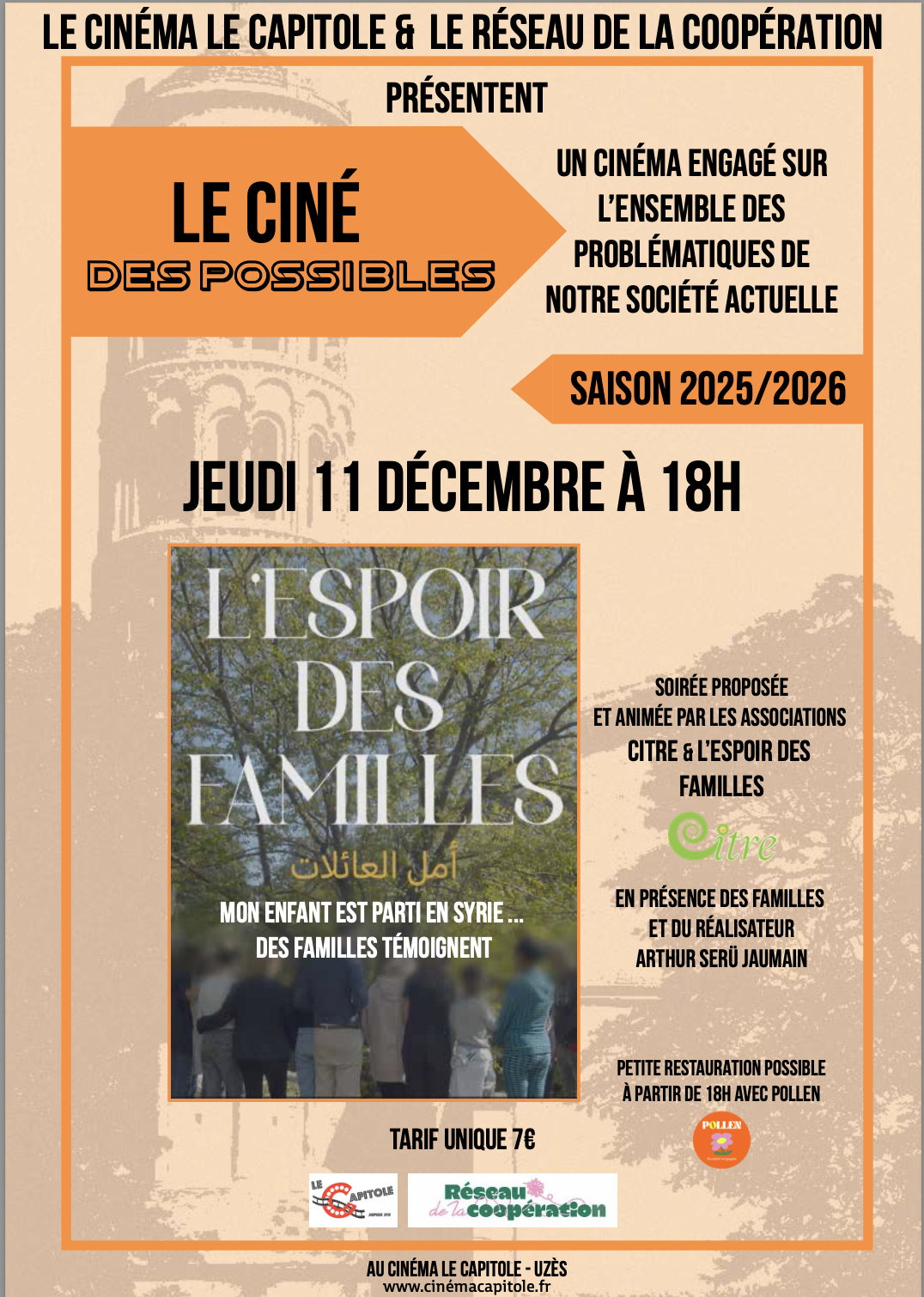 Pour clôturer cette année 2025, le Ciné des Possibles vous invite à une soirée engagée, conviviale et inspirante autour du film « L’Espoir des familles: mon enfant est parti en Syrie » d’Arthur Serü Jaumain.