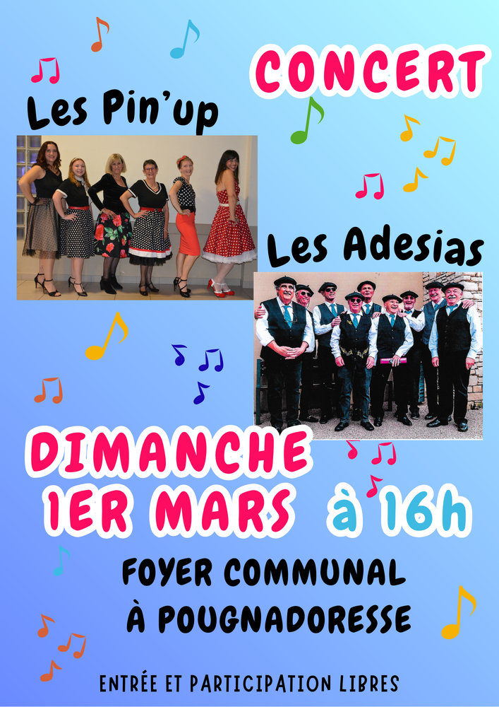 Les Adessias, une chorale masculine de huit hommes, proposent des chansons régionales de Corse, du Pays Basque, de Bretagne, et de Provence. Quant aux Pin’up, un groupe de sept femmes, elles reprennent des chansons des années 50, et des gospels.