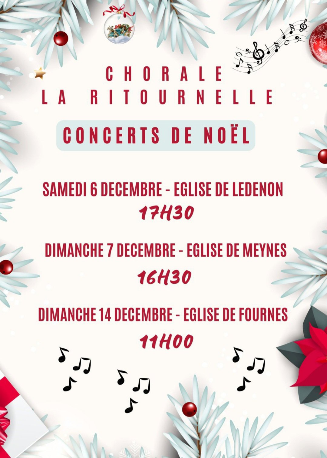 La Chorale La Ritournelle chante Noël lors de ses concerts en églises.Trois dates, trois lieux :Samedi 6 décembre – Église de Lédenon – 17 h 30.Dimanche 7 décembre – Église de Meynes – 16 h 30.Dimanche 14 décembre – Église de Fournès – 11 h.