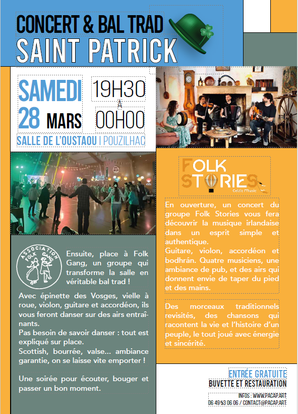 En ouverture, un concert du groupe Folk Stories vous fera découvrir la musique irlandaise dans un esprit simple etauthentique. Ensuite, place à Folk Gang, un groupe qui transforme la salle en véritable bal trad !