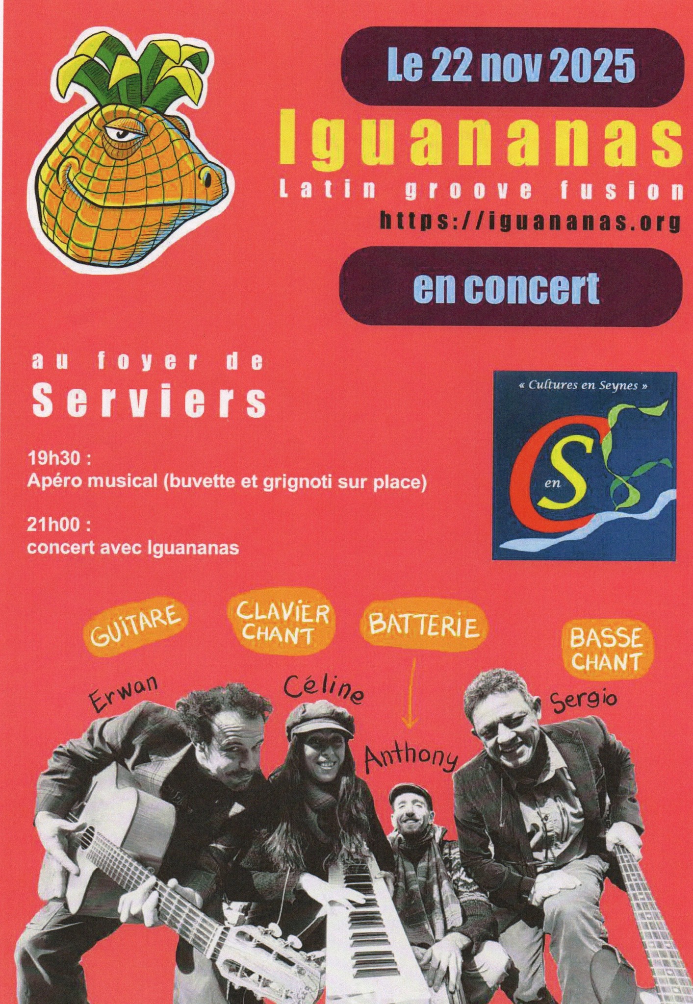 « Cultures en Seynes » vous propose un concert avec les « Iguananas » qui sont de retour ! De la convivialité et de la bonne musique chaleureuse pour une belle soirée d’automne au village. On va danser !